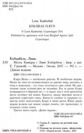 "Месть Кимеры" - это третья книга из серии "Дикая ведьм". В школе над Кларой стали подшучивать, и всё из-за того, что её дружок разболтал всем её тайну. На одной из таких стычек ребята перешли границу, и в результате Клара и один из её мучителей упали с крыши. Юная ведьмочка быстро пришла в себя, а вот её мучитель попал в больницу с серьёзными травмами. Но это ещё не всё! Кларе начали являться странные сны, в которых она всё время оказывается в мёртвом лесу. Может это как-то связанно с Кимерой и загадочным гротом?! Почему Клара всё время чувствует голод, который не может удалить, сколько бы не съела? Это прекрасную историю вы можете узнать, просто прочитав. Советую вам окунуться в мир магии и тайн....