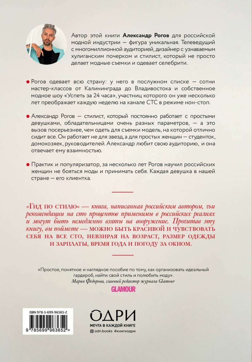 Александр Рогов, гуру безупречного стиля, создал идеальный гид по стилю для каждой женщины. Знаменитый эксперт предлагает начать с разбора шкафов и дает подробные инструкции по созданию базового гардероба. Открывает секреты, как с помощью одежды можно скорректировать фигуру, рассказывает о том, как правильно хранить одежду и аксессуары и, главное, делится стилистическими приемами на все времена. Книга не только наполнена уникальными советами, но и заранее отвечает на вопросы, которые могут появиться у читательниц. О том, что волнует его аудиторию, Александр знает благодаря своим мастер-классам, которые он поводит по всей России. В книге много фотографий с идеальными вариантами подбора одежды.