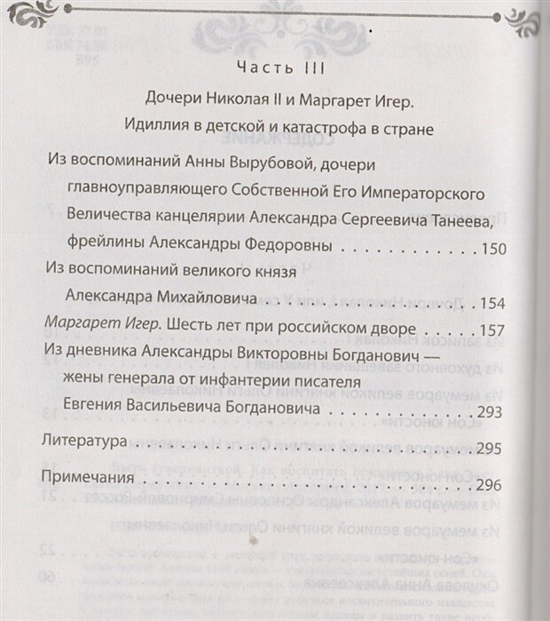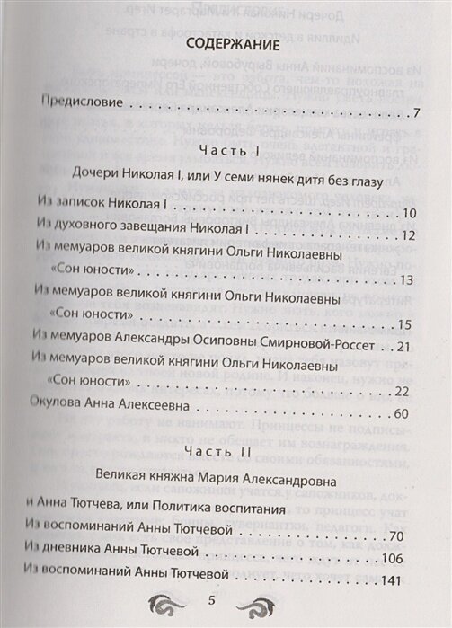 Очень интересная книга. Название не оправдало моих ожиданий. Скорее, книга о жизни дочерей Николая I, Александра II, Николая II из мемуаров дочери Николая I, воспитательницы дочери Александра II, ирландской воспитательницы дочери Николая II. Интересно увидеть Россию глазами иностранки, она обращает внимание на семейную жизнь крестьянок, устройство браков в сословии духовенства. Много новой, познавательной информации, цитаты раскрывают личности членов Императорской семьи. К сожалению, мало информации об особенностях их питания, почти нет информации о распорядке дня. Читая выдержки из книги, я заинтересовала мою не любящую читать маму прочитать эту книгу. Покупке рада, бумага белая, плотная. Книга стоит своих денег. Не порадовал редактор книги, так как есть описки вроде "в две раза"(стр.299), "отъезда из Россию" (стр.296) и еще в трех случаях.