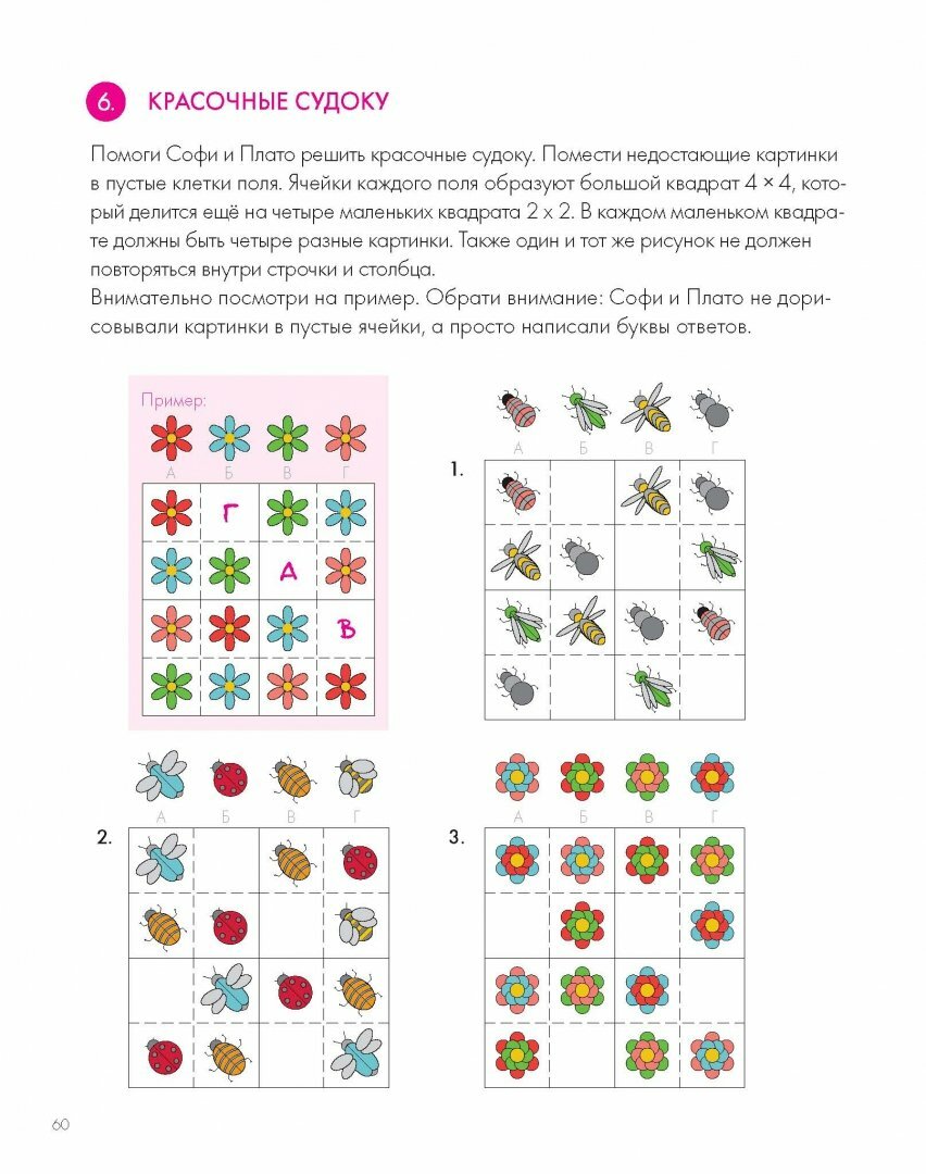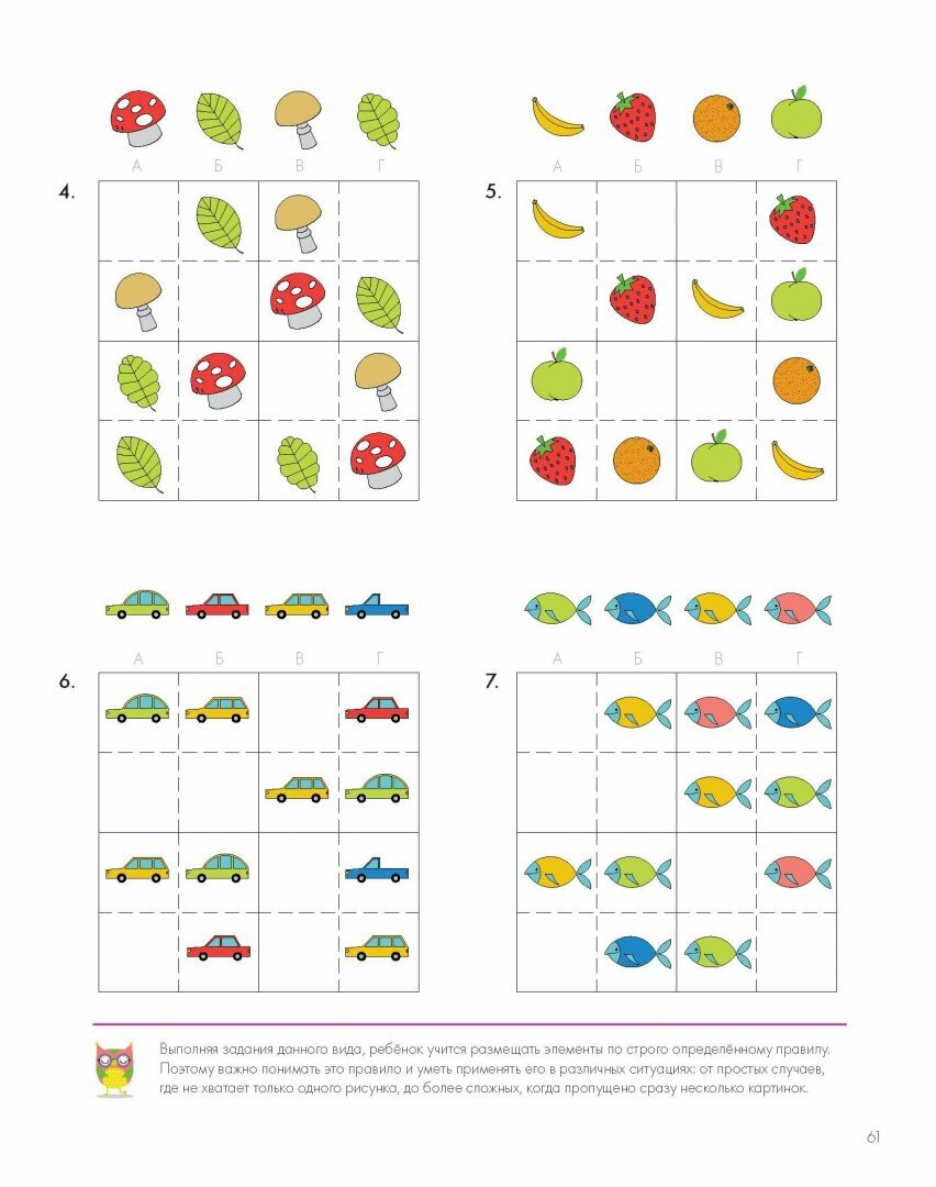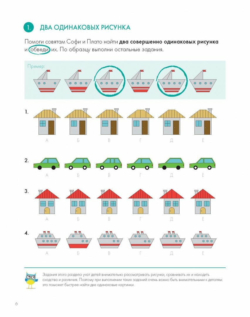 Перед каждым новым блоком заданий помощники совята Плато и Софи объясняют, что нужно сделать в том или ином задании и каким образом лучше всего выполнять задание. А для родителей внизу странички поясняют, чему именно научится ребенок при решении данных головоломок. Подобные виды упражнений часто встречаются в IQ- тестах, что точно пригодится детям в будущем.