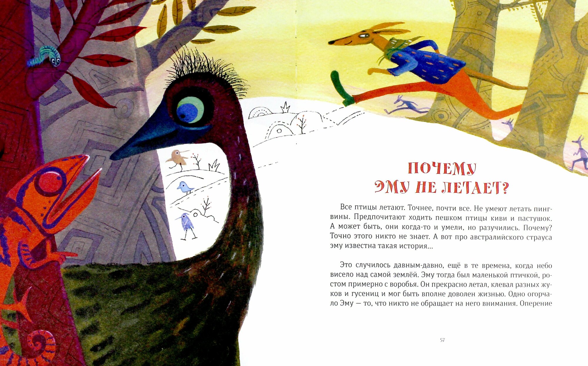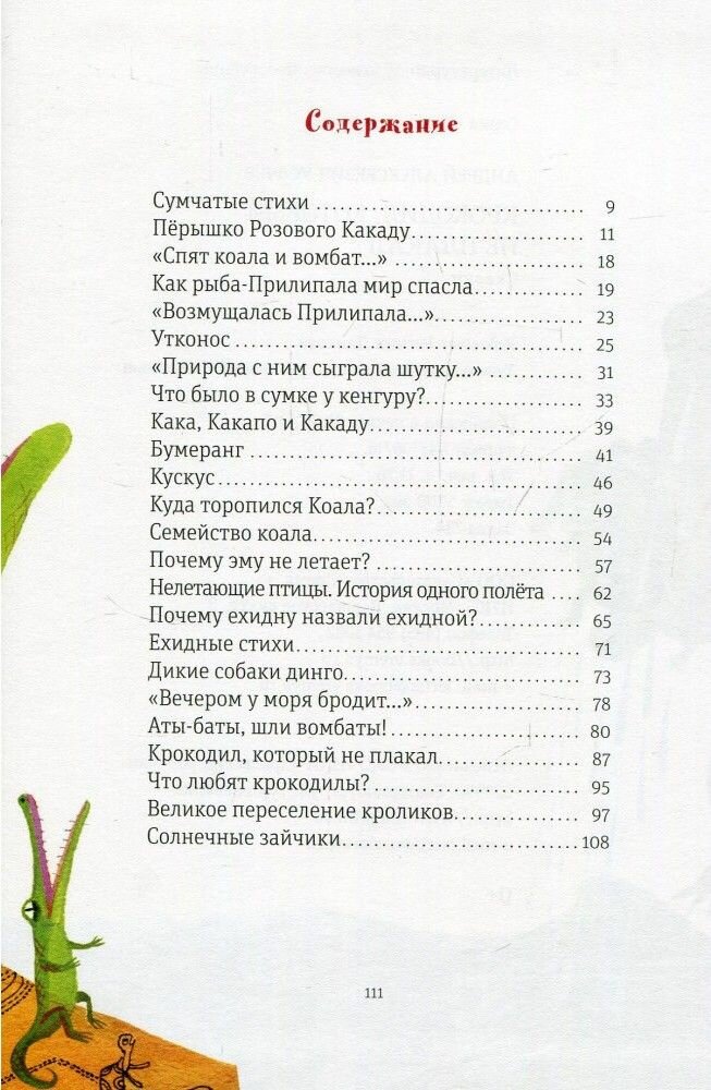 Замечательный детский писатель Андрей Усачев озабочен, как всегда, самыми серьезными вопросами: как рыба-прилипала спасла мир; почему утконос стремился на край света; что было в сумке у кенгуру; почему эму не летает; отчего дикая собака динго не хочет стать домашней; почему коала всегда опаздывает… Ответы на все свои вопросы Андрей Усачев на этот раз ищет в Австралии, где и водятся эти необычные для наших краев звери. Обо всех он написал, кроме одного. "Есть, говорят, в Австралии / Ужасный зверь кускус. / Такой он зверь... Я далее / Писать о нём боюсь. / Боюсь, что я начну писать, / А он начнёт кус-кус-кусать!" Ладно, отложим этого зверя до следующей книжки - авось Андрей Алексеевич станет смелей.