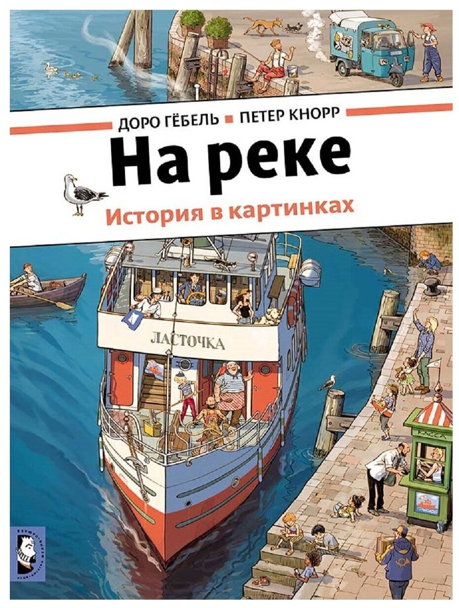 "На реке" - пятая книга в серии "История в картинках" от немецких художников Доро Гёбель и Петера Кнорра. Ранее вышедшие книги серии - "За городом" (2012) и "В цирке" (2012), "Однажды в городе" (2014), "Соседи" (2015). Каждая книга рассказывает об одном дне из жизни главных героев (все они отдельно вынесены на четвертую сторону обложки). Этот день насыщен разнообразными событиями, и внимательному читателю предлагается проследить все сюжетные линии героев, чтобы сложить их в целую картину. Книга "На реке" расскажет о том, как провели свой день пассажиры теплохода "Ласточка". Рано утром они пришли на пристань небольшого городка, купили билеты и поднялись на борт, где их приветствовали капитан и команда. Затем теплоход отчалил и поплыл вниз по течению, делая по пути остановки - на ферме, у паромной переправы и возле аквапарка под открытым небом. Не обошлось без происшествий: в пути у "Ласточки" сломался винт и понадобилось вызвать водолазов, чтобы его починить. Наконец, вечером, после всех приключений "Ласточка" прибыла к месту назначения - в большой морской порт, и пассажиры как раз успели к началу музыкального фестиваля. "История в картинках" - это настоящее немое кино. Рассматривая книгу без слов, дети научатся видеть и подмечать детали, прослеживать логические связи между событиями, самостоятельно составлять рассказ по картинкам. В книге столько сюжетных линий, что невозможно проследить их все за один раз. Они переплетаются, пересекаются, происходят одновременно, как в настоящем кино - и как в настоящей жизни!