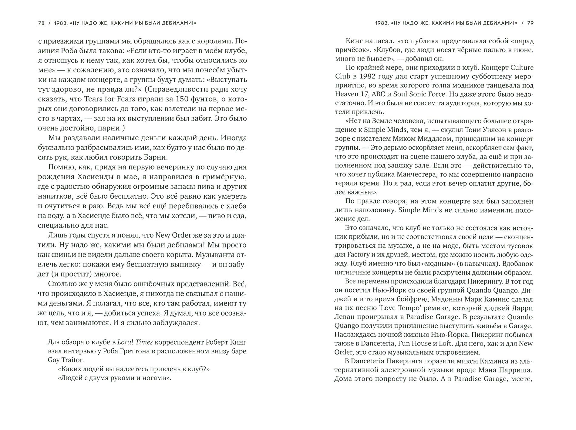 Вот и я, наконец, познакомился с записками бывшего басиста легендарных групп Joy Division и New Oder Питера Хука, о том,как не стоит управлять клубом. Книга представляет историю манчестерского клуба Hacienda месте зарождения хаус музыки в Британии. Месте выступлений легендарных диджеев как Марк Пэкиринг Sasha, Джона Дигвида и прочих. Книга будет ценна для любителей истории электронной музыки так сказать что и как было изнутри ( вся кухня, истории зарождения рэйвов и финансовые отчеты о деятельности клуба) все это вы там увидите и прочее.