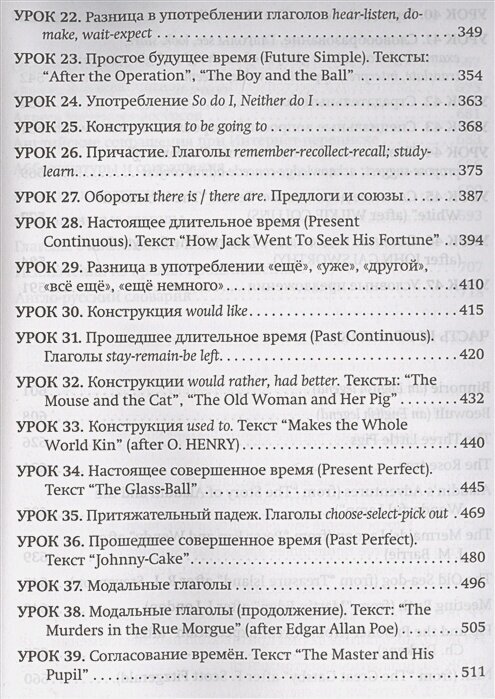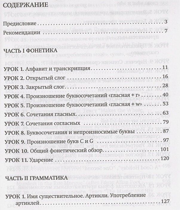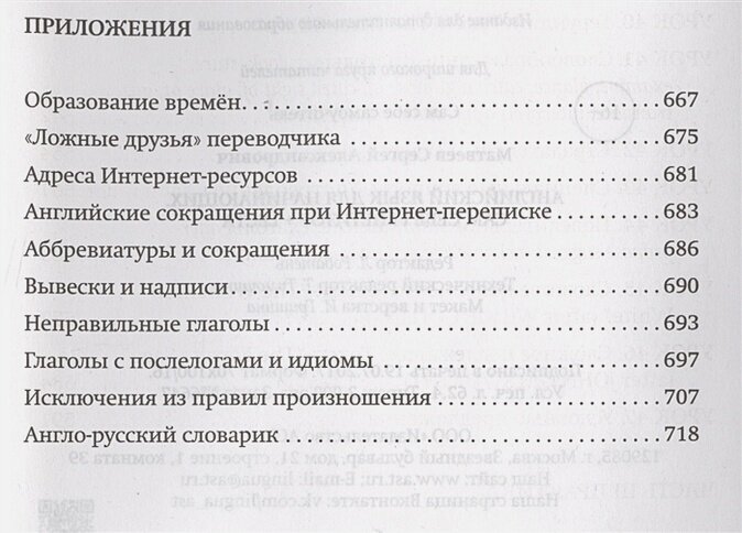 Уровень владения английским у меня около среднего. Заказала эту книгу, так как хотела пройтись по правилам грамматики и чувствовать себя более уверенно. Книга массивная, жёсткие корочки, но страницы тонкие, текст через них просвечивает, поэтому нужно листать книгу аккуратно. Шрифт приятный, крупный и четкий. Начинается книга с азов — произношения букв и буквосочетаний, чтения слов - и заканчивается практикой в виде текстов на английском. Главная особенность этой книги — огромное количество упражнений и быстрое накопление словарного запаса по мере чтения книги. Как мне показалось, цель автора больше заключалась в том, чтобы поскорее научить читателя пользоваться языком, а не преподносить кучу теории, как это делается во всех справочниках. Однако мне не понравилось, что по временам как раз-таки очень мало теории, они проходятся совсем поверхностно. Поэтому если хотите владеть языком свободнее, подумайте о том, где взять теорию по временам. Также акцент поставлен автором и на правильное произношение. Хорошо, если вы берётесь впервые за английский язык и у вас в руках эта книга. К каждому новому слову дана транскрипция, поэтому с говорением на английском проблем уже будет меньше. В конце книги есть англо-русский словарик.