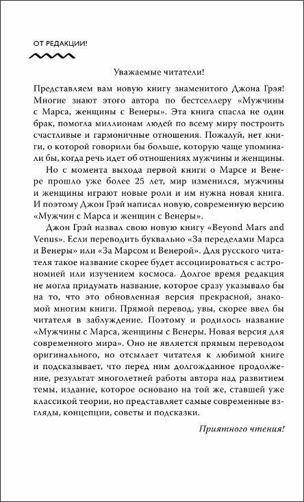 Развод! Это не новая версия "Мужчин с Марса, женщин с Венеры". И ничего общего с оригиналом не имеет! Книга на английском называется Beyond Mars and Venus. Судя по всему новый издатель уже не первый раз поступил по принципу "паразитного маркетинга", использовав название оригинальной книги, и написав в аннотации, что приемы из нее уже не работают — в оригинале об этом речи не было.