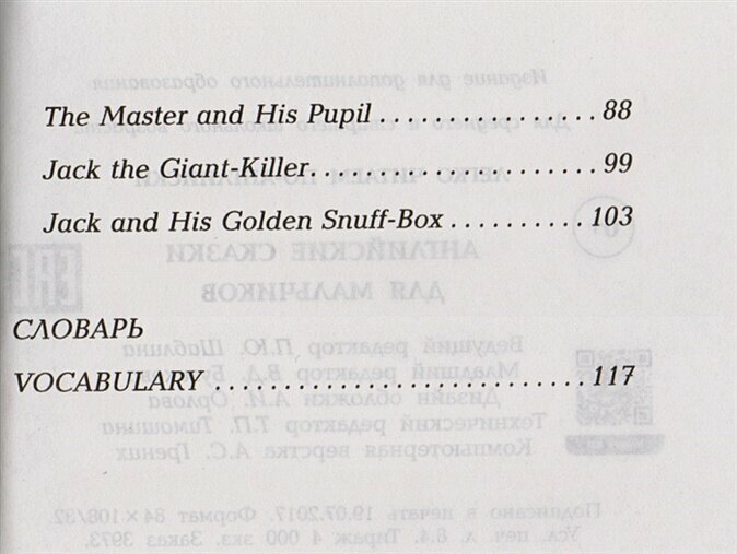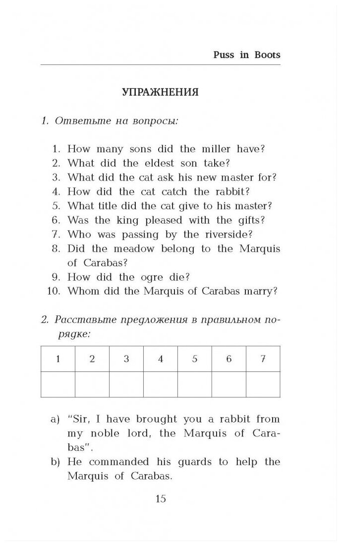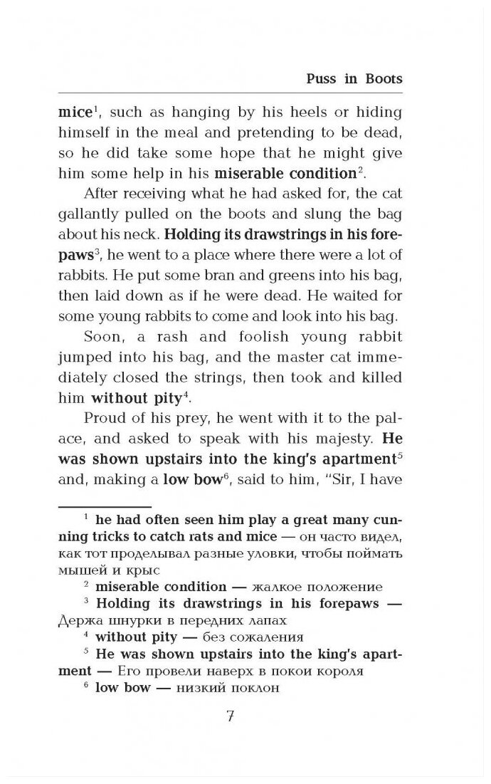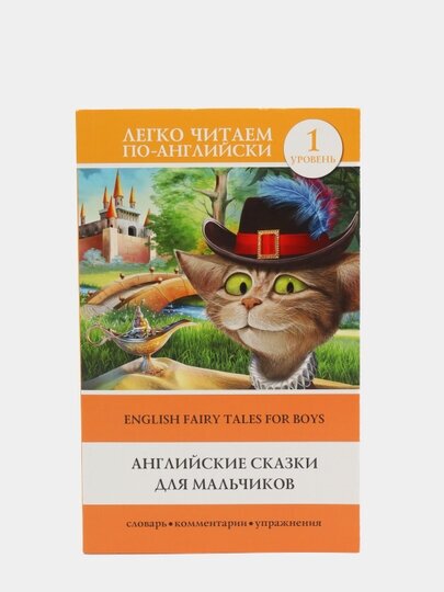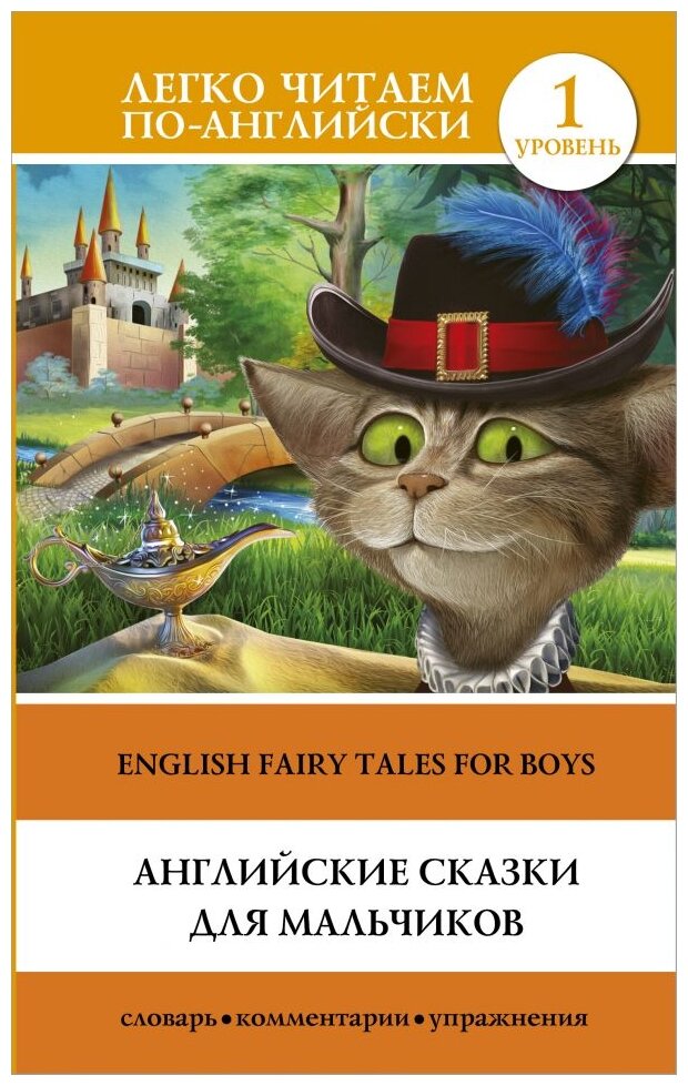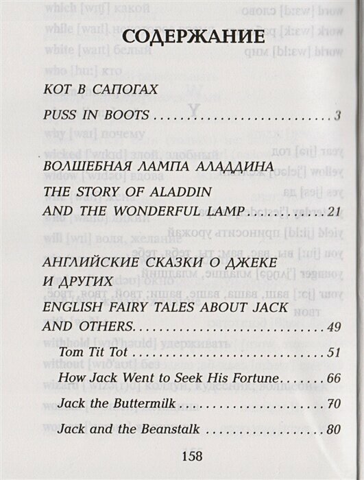 В книге знаменитые "Кот в сапогах" и "Аладдин", а также семь старых английских сказок. Кстати, "Волшебная лампа Аладдина" дублируется, поскольку в серии уже издавалась отдельной книжкой. Хотя в этом варианте немного другой, более подробный текст. В этой книге очень подробные задания к каждой сказке. Читается легко, с интересом. В конце книги переводы словосочетаний и слов.