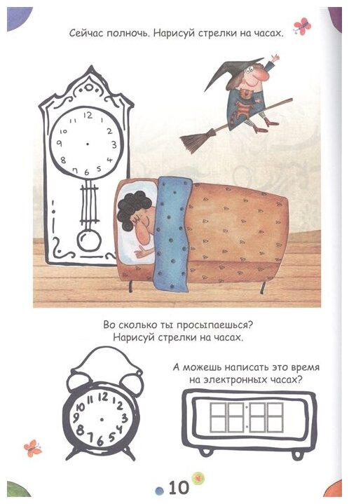 Пособие понравилось, но к сожалению нет логической последовательности в заданиях. Приходится самой листать и искать задания, с которыми ребенок уже справится для отработки понимания азов, а дальше переходить к более сложным заданиям (например, использование на электронных часах времени с 12 до 24 часов). В целом задания интересные, в меру красочные, охватывают пожалуй всё, что можно по часам и утро-вечер и минуты (четверти и половины и минуты) и электронные табло.