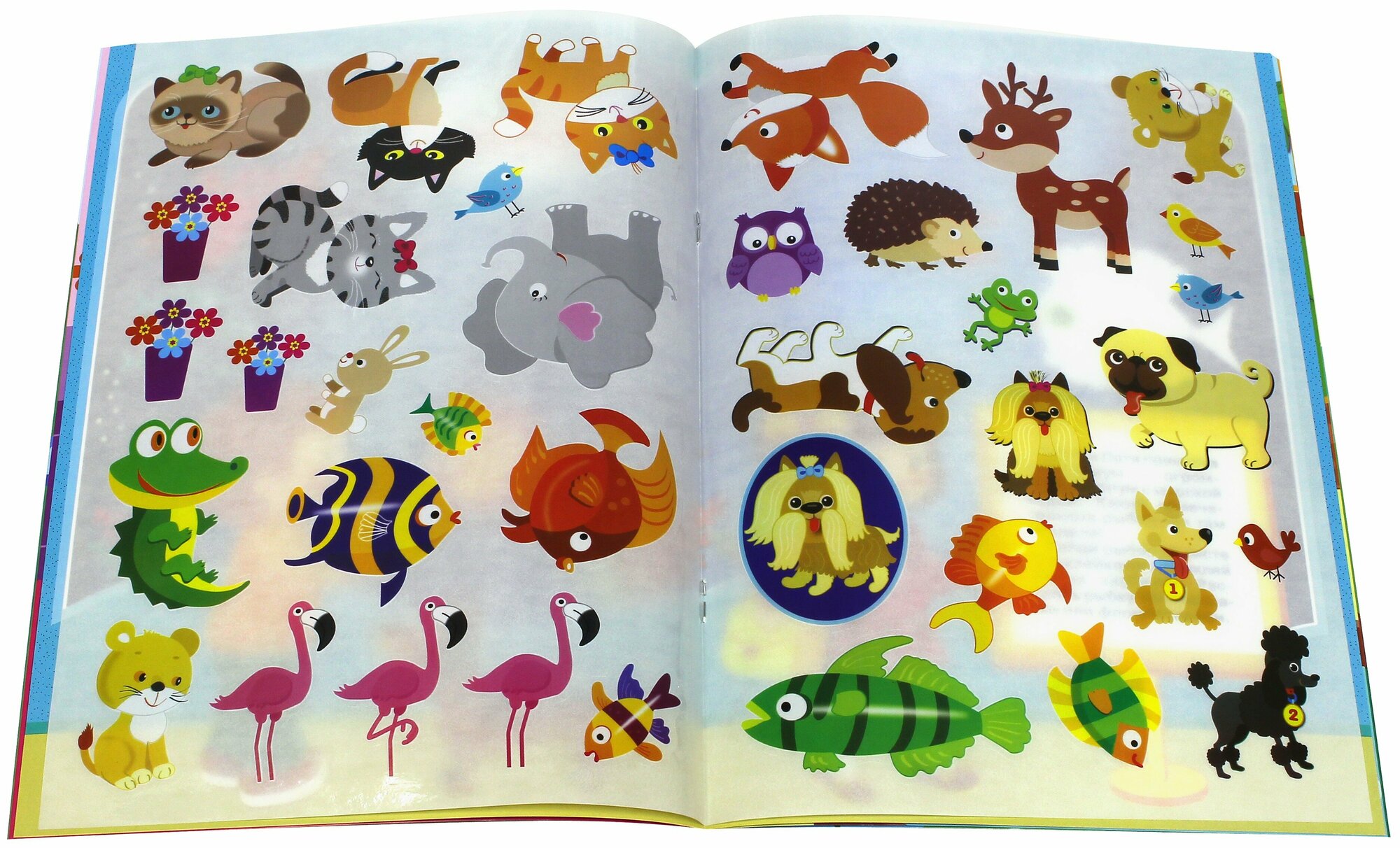 Внутри книжки лист с наклейками, с их помощью можно дополнить каждую картинку деталями, предметами или персонажами - надо только проявить фантазию.
