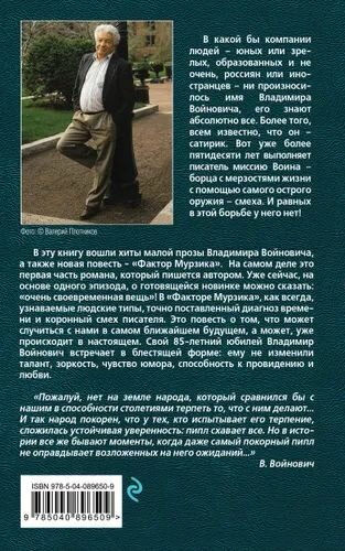 В эту книгу вошли хиты малой прозы Владимира Войновича, а также новая повесть — "Фактор Мурзика". На самом деле это первая часть романа, который пишется автором. Уже сейчас, на основе одного эпизода, о готовящейся новинке можно сказать: "очень своевременная вещь"! В "Факторе Мурзика", как всегда, узнаваемые людские типы, точно поставленный диагноз времени и коронный смех писателя. Это повесть о том, что может случиться с нами в самом ближайшем будущем, а может, уже происходит в настоящем. Свой 85-летний юбилей Владимир Войнович встречает в блестящей форме: ему не изменили талант, зоркость, чувство юмора, способность к провидению и любви.