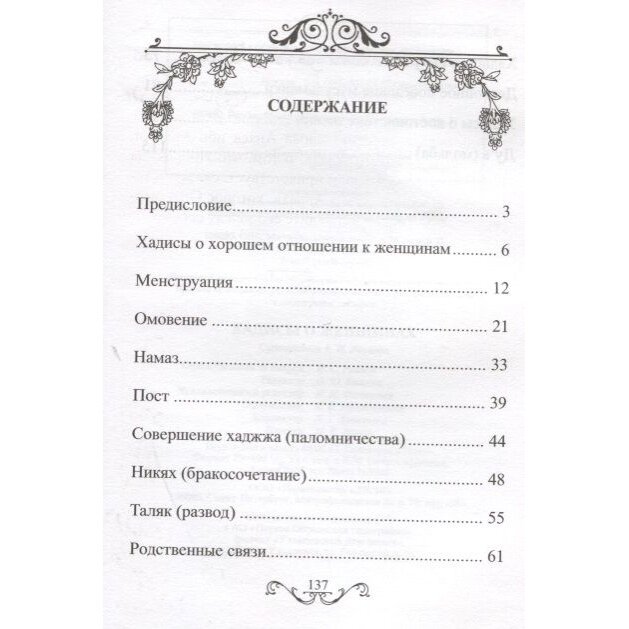 По содержанию ее можно поделить на несколько частей - вначале приводятся достоверные хадисы о положении женщины в исламе, их привилегиях и послаблениях, облегчающих выполнение ими предписаний Всевышнего.