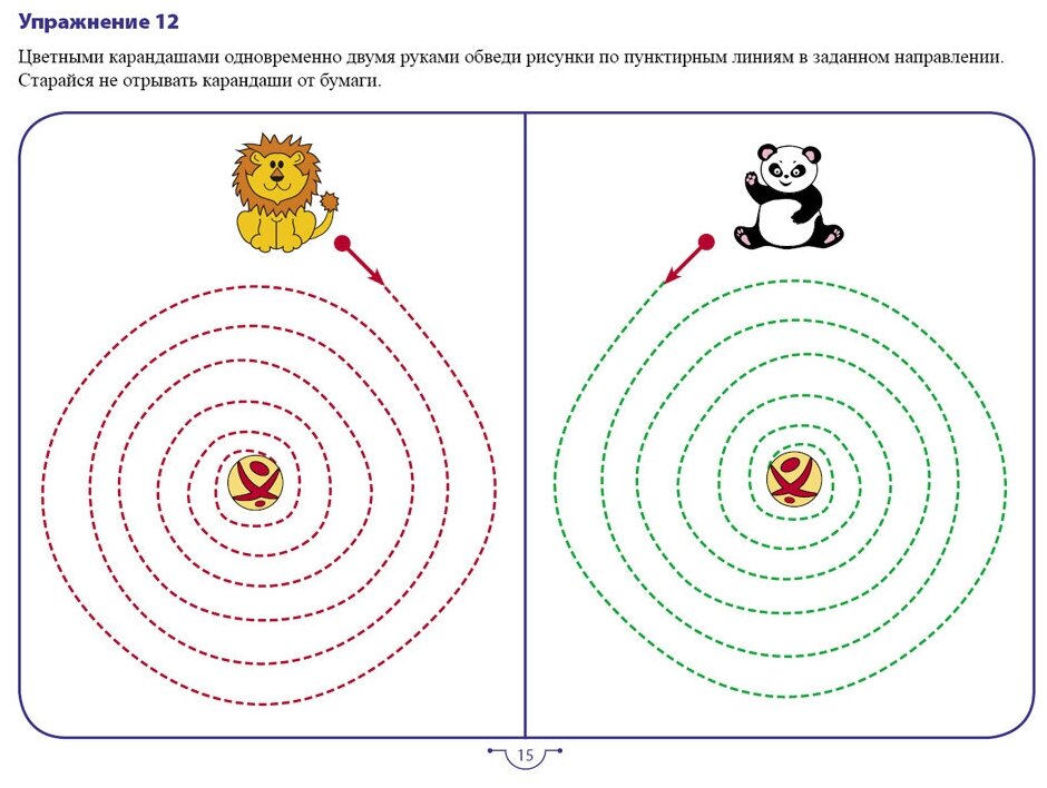 Альбом содержит графические упражнения, которые надо выполнять обеими руками. Задания разного уровня сложности. Я заламинировала все страницы, получилось многоразовое пособие. Теперь можно рисовать маркером на водной основе и стирать сколько угодно раз. Рекомендую!