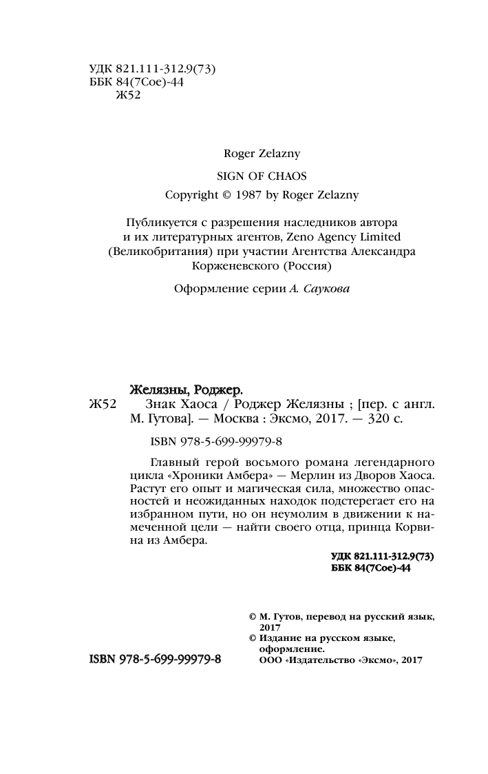 Книга: Знак Хаоса (Роджер Желязны); Эксмо, Редакция 1, 2017