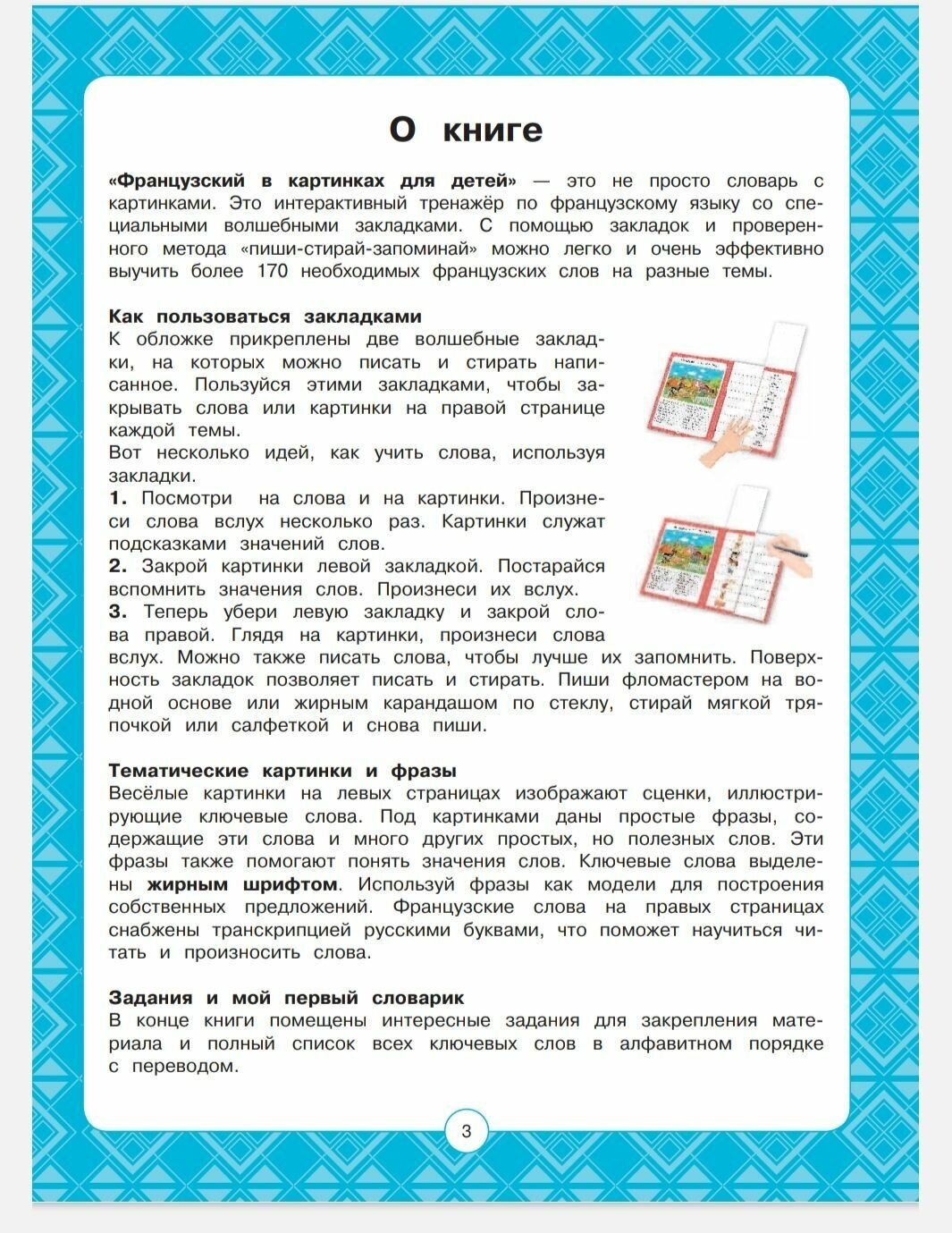 Эта детская книжка с картинками отлично подойдет для начала занятий французским языком. В ней вы найдете слова и простые предложения по 19 самым необходимым темам. Главная особенность этой книги в том, что она - интерактивная. Специальные закладки, используемые для запоминания и проверки, позволяют детям легко и быстро выучить около 170 слов французского языка. Ребенок может писать слова на закладках и стирать написанное, последовательно осваивая предложенные темы. В процессе обучения помогают занимательные картинки, иллюстрирующие слова и фразы, а также транскрипция к словам. Для младшего школьного возраста