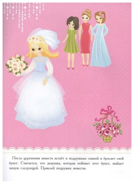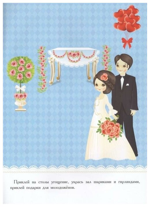 Ах, эта свадьба! Жених и невеста такие красивые и счастливые! Вокруг все веселятся, зал украшен цветами и шарами, на столах угощение! Хотите попасть на праздник? Тогда скорее открывайте нашу книжку. Приклеивайте свадебные наряды, цветы и сердечки,