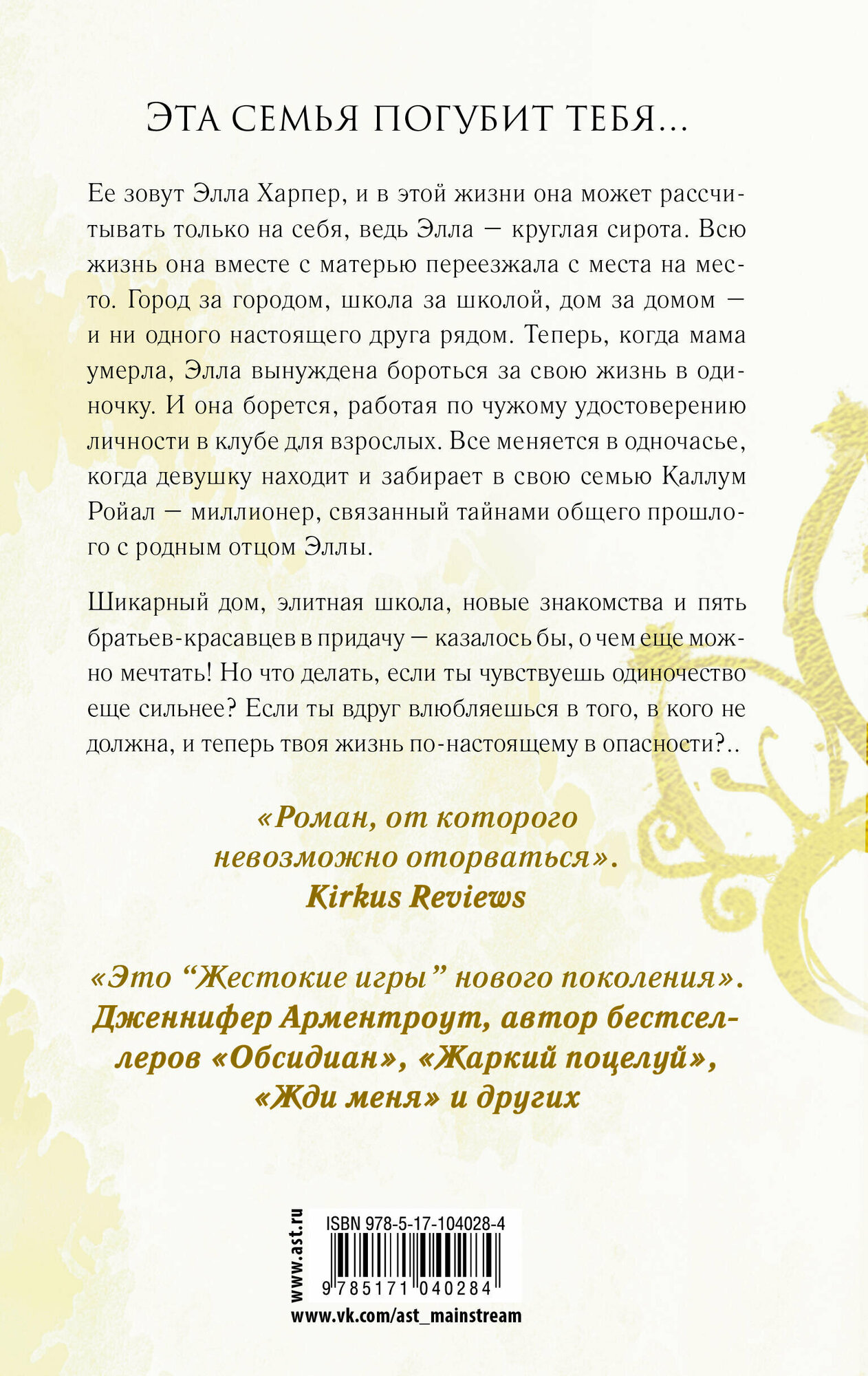 Пару месяцев назад наткнулась на эту книгу в группе издательства АСТ ,очень заинтересовала аннотация книги и стала ждать выхода книги. Как только увидела,её book 24 сразу заказала и ни капельки не пожалела,книга захватывает с первых страниц,что даже оторваться сложно. Конец конечно оставил много вопросов,за что? Почему? Искры между главной героиней и одним из братьев Ройалов видны с первой встречи героев. Хотя все пять братьев красавцы. Кто то скажет в ней много клише,но они не мешают книге быть действительно интересной. Я любитель такого жанра и эта книга для меня !