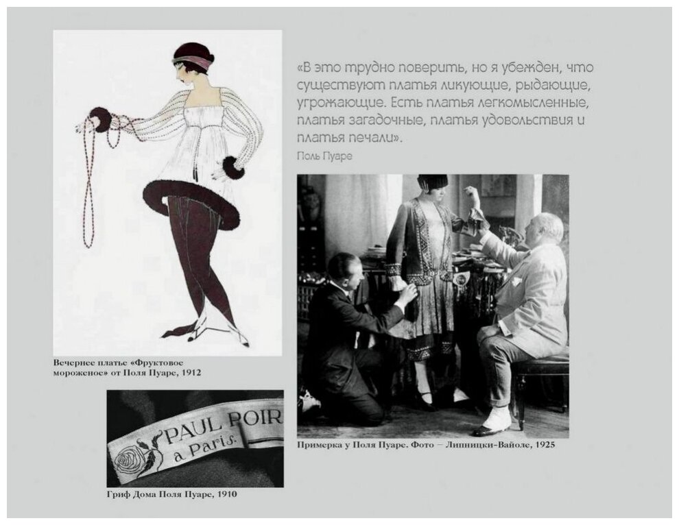 Поль Пуаре в годы написания своих мемуаров уже сошел с Олимпа большой моды и не случайно назвал их - "Одевая эпоху". Более точного названия и придумать было невозможно - именно эпоху! - целое поколение прекрасных дам, небожительниц belle epoque одевал он, делая это изысканно и элегантно.