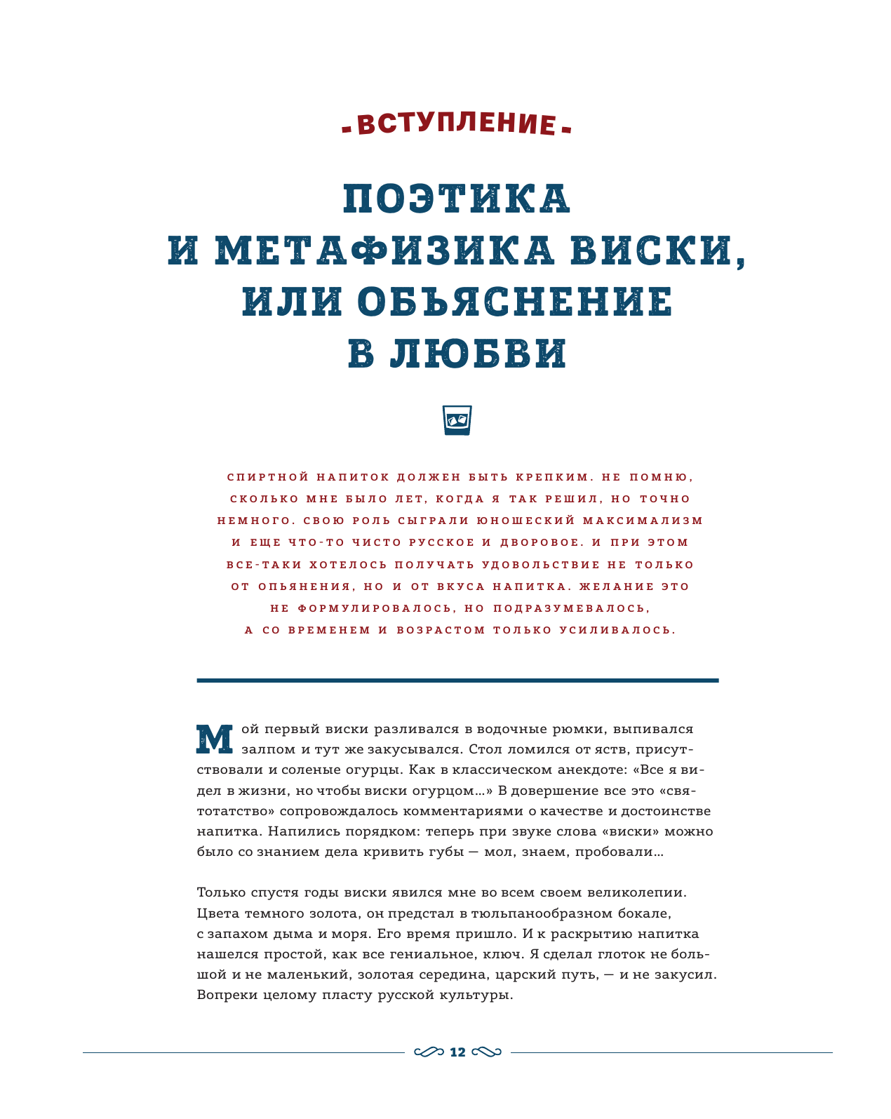 Книга написана вкусно, с небольшой долей юмора, но юмор это хорошо, это показывает правильное отношение автора к жизни. Фолиант довольно объемный и тяжеленький, не в последнюю очередь, из за толстой бумаги из которой она и собрана. Когда переворачиваешь такую страницу, иногда появляется ощущение, что зацепил случайно не одну а пару страниц, но при проверке оказывается что нет, нумерация идет по порядку, все хорошо, можно читать дальше. Оформлена довольно красочно и оригинально сверстана. Стильные, иногда милые иллюстрации, которым на мой взгляд, не достает только одного: комментариев под ними. Иногда просто интересно знать, у какой конкретно вискокурни эта симпатичная крыша или в подвалах какой вискокурни такими рядами пылятся бочки. По содержанию, вопросов нет. Что то уже знал и до прочтения (книгу пока не дочитал до конца, смакую так сказать), что то было новым и даже в каком то роде открытием. В общем, сидя вечерком в кресле, потягивая из бокала вкусный виски, как и советует автор, книга заходит на ура. Для любителей виски, самое оно. Покупкой доволен, чуть более, чем полностью ;)