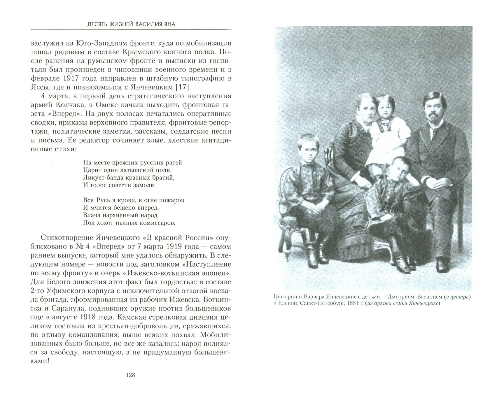 В начале 18 г. Янчевецкий на стороне белых – выпускает газету. Служил у Колчака, получил звание полковника. После разгрома белых в Сибири стал учителем в глубинке. Чуть не был расстрелян красными, чудом спасся. Попробовал уехать за границу – не пустили. Снова стал журналистом, перебрался в Москву. Писал пьесы (в основном детские). Устроился в Госбанк, но не удержался и уехал в Самарканд. Интересно – многие люди знали о том, чем занимался Янчевецкий во время Гражданской войны, но никто не донес на него, а арестованные не рассказали…