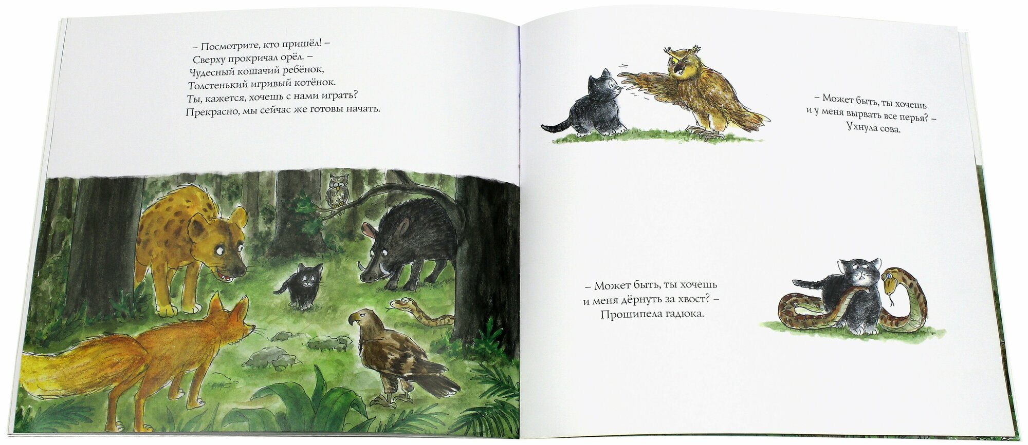 Мне книжка чем то напомнила Тимоти Скотта, история поучительная (о приключениях котёнка и определении кто твой друг), стихотворный слог немного необычен, но к нему привыкаешь и нравится, иллюстрации очень милые, хорошо прорисованы, бумага не просвечивает, гладкая.