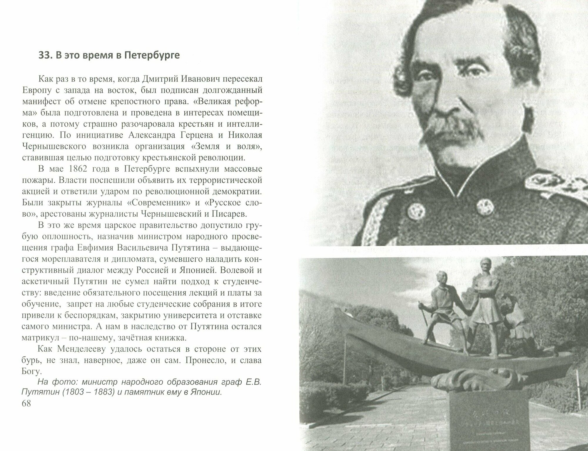Свежий взгляд на знакомую историческую личность. Каждый разворот книги - новая история из жизни ученого, сопровождаемая иллюстрацией, обычно исторической фотографией. Читать можно с любой страницы. Написана химиком, увлеченным историей науки и не похожа на другие биографические издания. Не претендуя на полноту изложения биографии Д.И. Менделеева, автор открывает неизвестные ранее моменты его жизни. Информация использовалась для внеклассных мероприятий в школе, посвященных Периодической системе. Недостаток - мягкая обложка, склейка, но это - не главное.