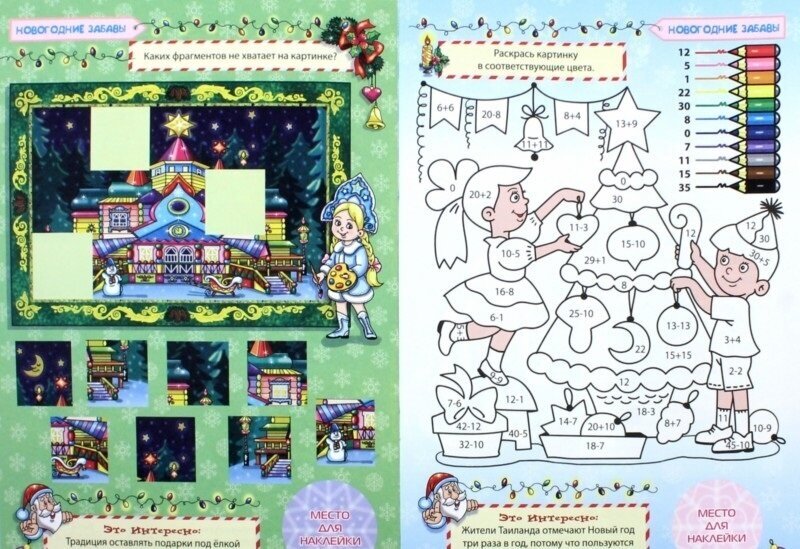 В книге есть не только задания для малышей, но и любопытные факты про новый год в рубрике «как у них», поделки и рецепты новогодних вкусняшек. Малышам понравятся раскраски, наклейки. А в семейном кругу можно играть в новогодние фанты с детьми…