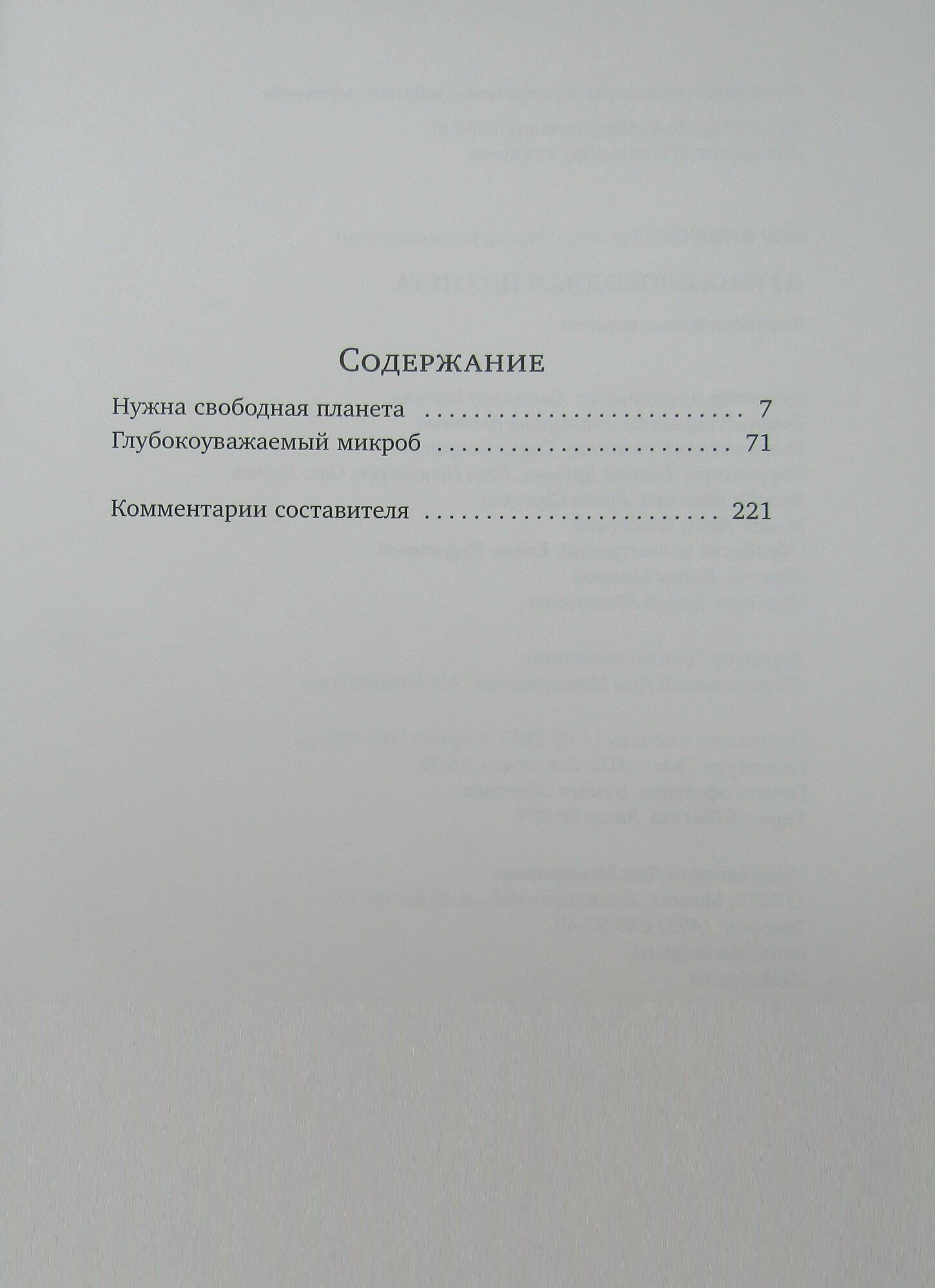 В книге 2 произведения: "Нужна свободная планета" и "Глубокоуважаемый микроб". Во второй повести(большей по объему) одна полностраничная иллюстрация, 2 на полстраницы и 5 зарисовок на полях. В первой - всего 1 зарисовка в углу страницы. Издание носит гордое название Большого ИЛЛЮСТРИРОВАННОГО собрания сочинений.