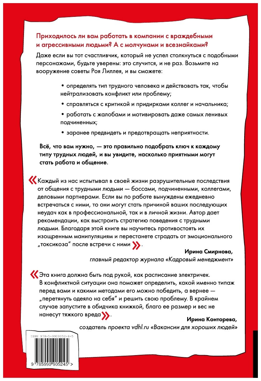 Рой Лиллей, эксперт в области трудовых отношений, уверен, что работать эффективно и получать удовольствие от общения можно даже в компании с трудными людьми. В своей книге он рассматривает классические типы сложных характеров, с которыми вы столкнетесь в любом коллективе. Поняв, что они думают и почему действуют так, как действуют, вы сможете избежать массы неприятностей и проблем. А усвоив советы Лиллея по стратегии поведения с трудными людьми, вы добьетесь положительных результатов и улучшите атмосферу в офисе. Ведь даже самые трудные люди не помеха, просто надо знать, как с ними договориться.