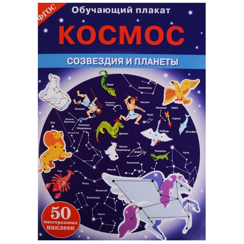 Благодаря этому плакату ты сможешь совершить увлекательное космическое путешествие не выходя из дома. Найди на листах с наклейками картинки, соответствующие созвездиям, и приклей их на полушария звёздного неба.