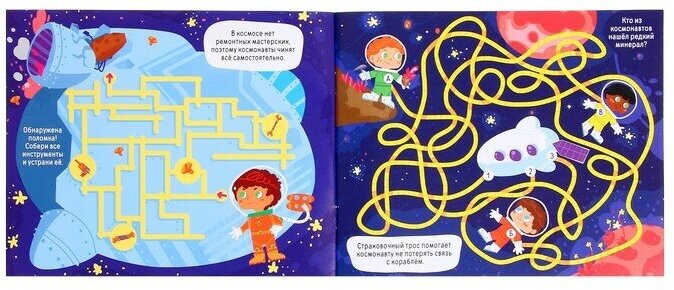 Вроде простая, но очень приятная книжица. Плотные листы скреплены пружиной. Лабиринты для парня 6 лет в самый раз. Плюс, на каждой странице - подборка интересных фактов, которые уже умеющего читать и интересующегося темой Космоса ребёнка заинтересовали: он мне читал, задавал вопросы - мы обсуждали. Прочитав, отложили - думаю, ещё вернёмся, в поездке, например, ибо формат удобный.