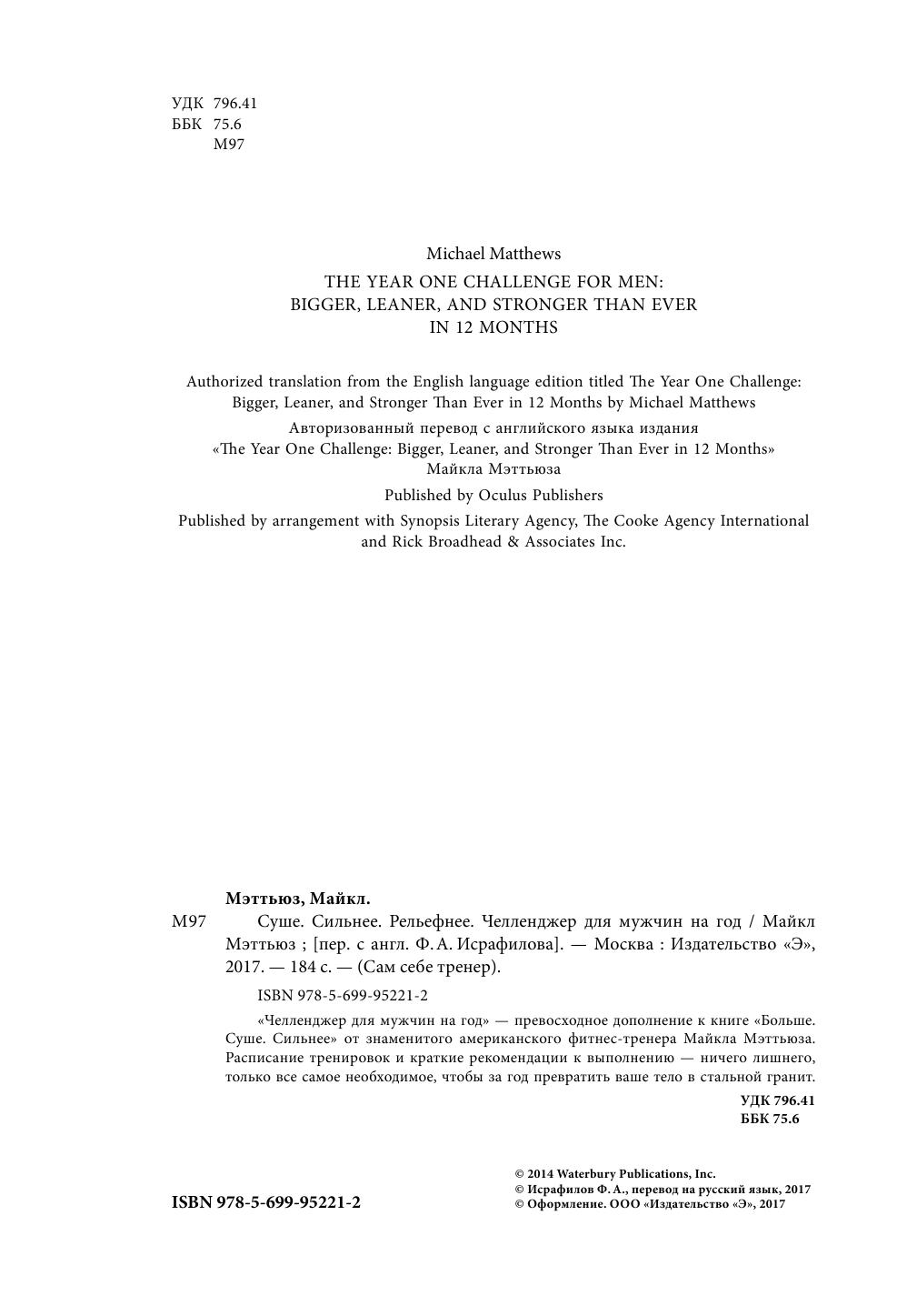 После прочтения предыдущей книги Майкла Мэттьюза ожидал больше ответов на свои вопросы. К сожалению здесь их не нашел. Эта книга, как написано в названии, план тренировок на год с ежедневными комплексами упражнений. Со своей миссией она справляется, но ее читать нужно строго после книги "Больше. Суше. Сильнее. Простая наука о построении мужского тела".