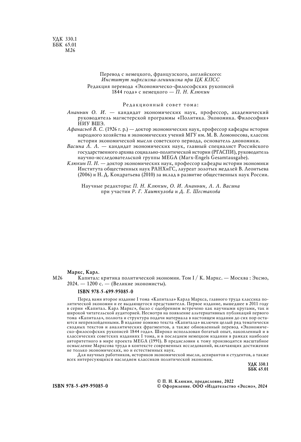 Перед вами второе издание I тома "Капитала" Карла Маркса, главного труда классика политической экономии и ее выдающегося представителя. Первое издание, вышедшее в 2011 году в серии "Капитал. Карл Маркс", было с одобрением встречено как научными кругами, так и широкой читательской аудиторией. Несмотря на появление альтернативных публикаций первого тома "Капитала", полнота и структура подачи материала в настоящем издании до сих пор остаются непревзойденными. В издание помимо текста "Капитала" включен целый ряд тематически сходных текстов и аналитических фрагментов, а также обновленный перевод "Экономическо-философских рукописей 1844 года". Широко использован богатый опыт, накопленный и в классических советских изданиях I тома, и в последнем немецком издании в рамках наиболее авторитетного в мире проекта MEGA (1991). В предисловии к тому производится масштабное осмысление Марксова труда в контексте современных исследований, включающих достижения не только экономических, но и естественных наук.
