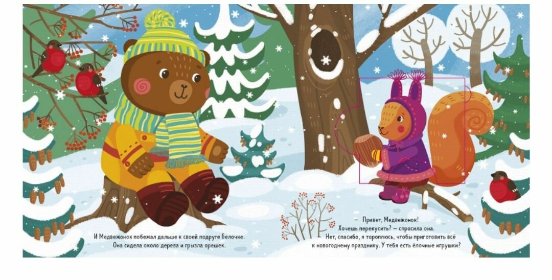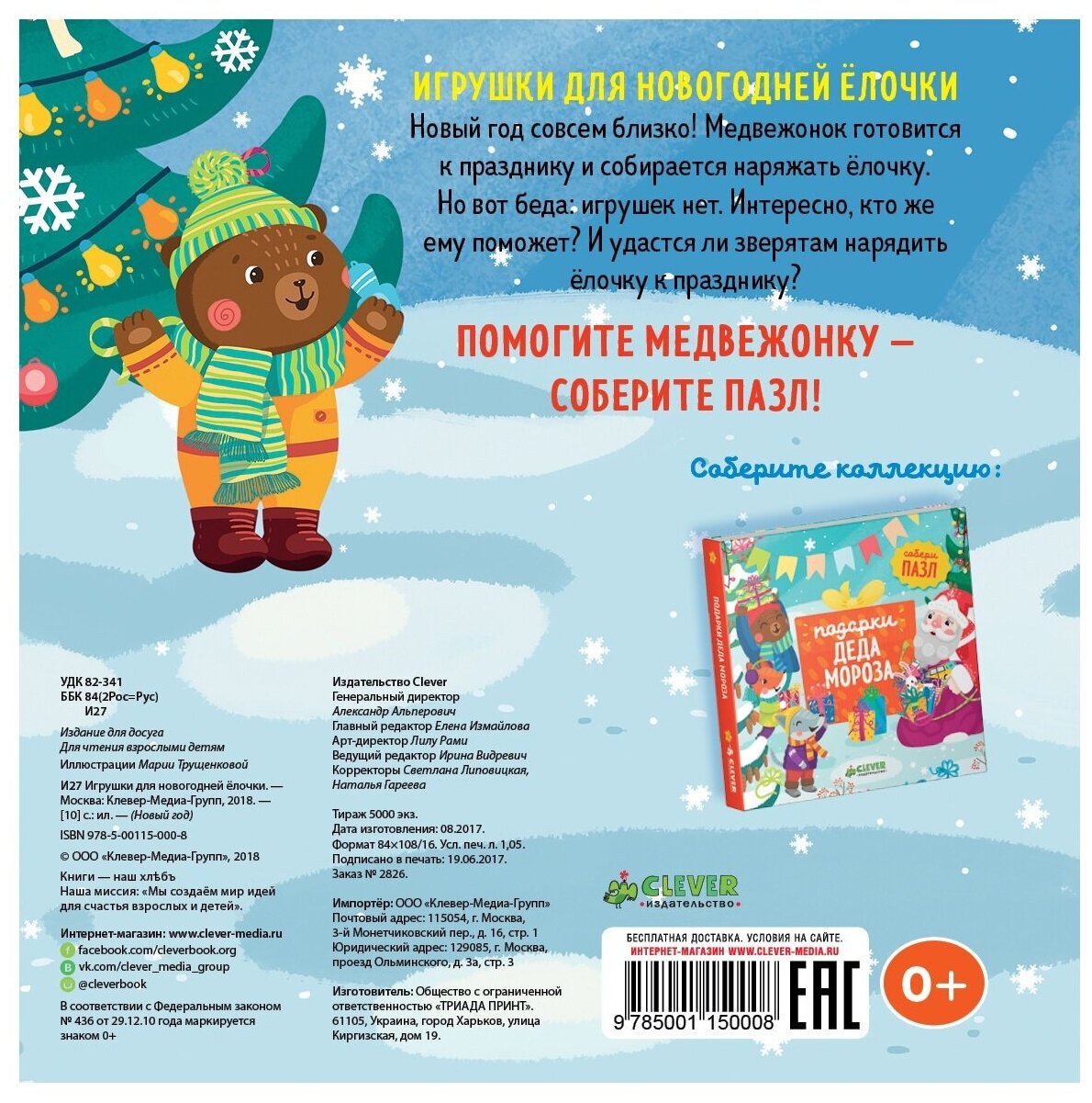 Новый год совсем близко! Медвежонок готовится к празднику и собирается наряжать ёлочку. Но вот беда: игрушек нет. Интересно, кто же ему поможет? И удастся ли зверям нарядить ёлочку к празднику? Помогите медвежонку и вы — соберите пазл в конце книги. Красочные иллюстрации с крупными элементами, простой текст, интересные задания — все для того, чтобы малыш учился с удовольствием. Оригинальный формат не позволит ему заскучать: следуйте за повествованием, вынимайте детали на каждой страничке, а в конце собирайте все элементы воедино, — так вы узнаете, чем закончилась новогодняя история. Удобные толстые странички легко перелистываются. Отличный тренажёр для развития мелкой моторики. Можно вместе рассматривать яркие картинки и придумывать разные истории. Удобный формат позволяет брать книжку в дорогу и на прогулку. Обязательно хвалите ребенка за старание.