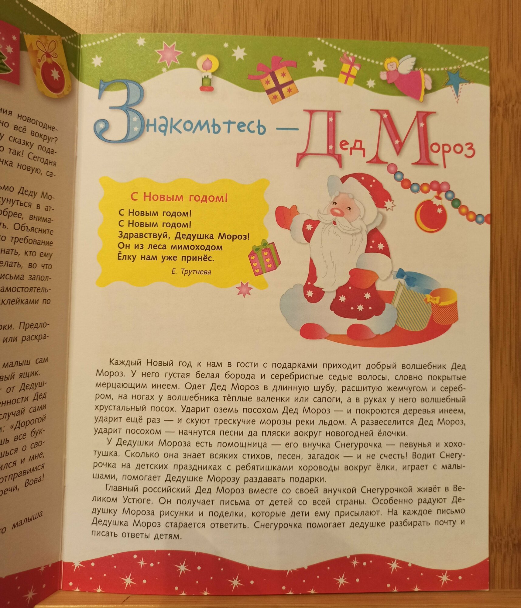 Покупаем именно эту книгу уже второй год. Здесь и рассказы про Дедов в разных концах света, и наклейки, и загадки! Также можно вместе с малышом вырезать и склеить конверт, написать письмо на красивой бумаге и отправить послание Деду Морощу, наклеив необходимые марки! Ребёнок будет в восторге