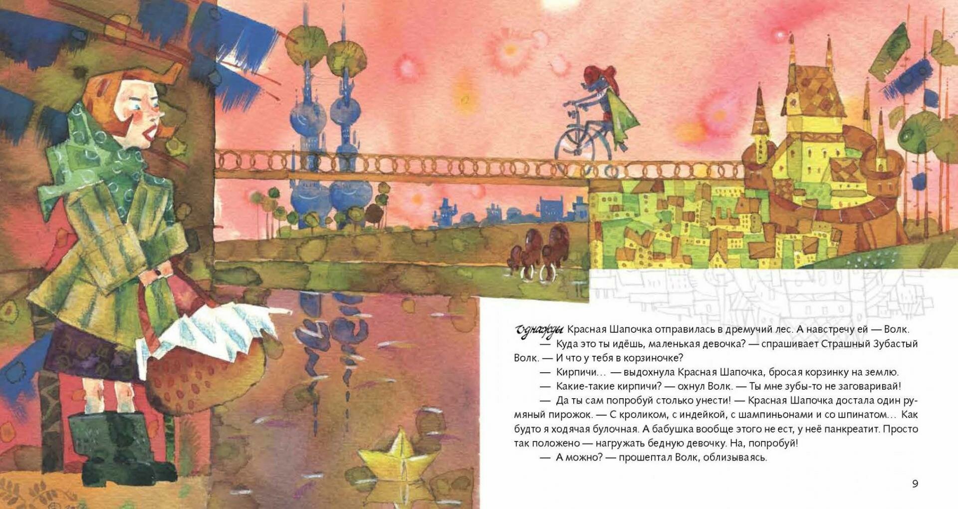 Художник Алексей Капнинский создает в своих рисунках целый мир — этакое альтернативное Тридевятое царство. И в этом царстве очень живо и органично существуют волк, Красная Шапочка и другие сказочные персонажи. На мой взгляд, очень удачный пример сотрудничества писателя (даже двух писателей!) и художника. Моей дочке эта версия сказки про Красную Шапочку понравилась даже больше, чем классическая. Не только из-за рисунков. Просто тут Шапочка разъезжает на самокате, спорит с Волком, шляпки в магазине примеряет – в общем, отличается недюжинной харизмой.