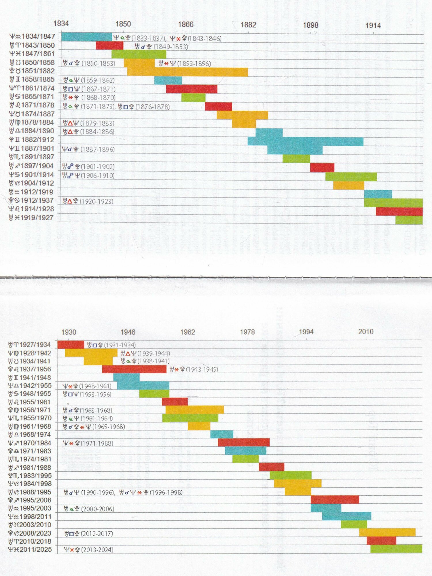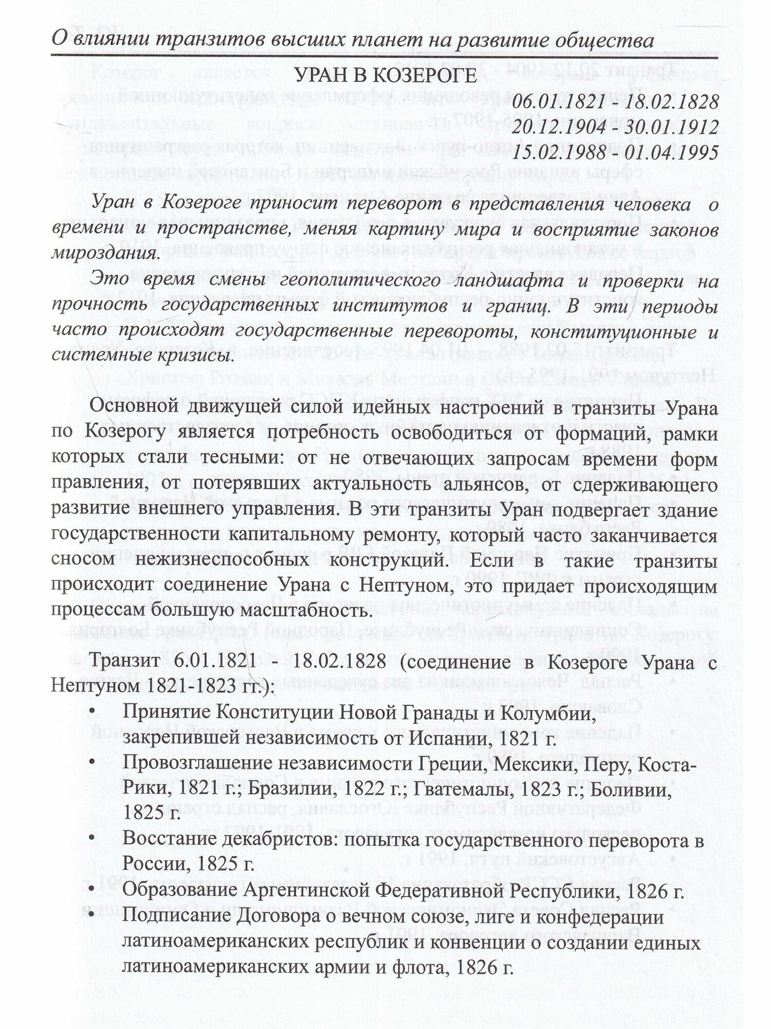в конце книги даётся таблица Транзитов, начиная с 1837 года, где просто показано, какая планета в каком знаке (Уран, Нептун, Плутон). Причем, про Плутон написано, что он в Козероге с 26.01.2008 по 23.03.2023. Нептун в Рыбах с 4.04.2011 по 30.03 2025, а про Уран в Овне последний озвученный период 28.05.2010 по 15.05.2018. Логично предположить, что следующий период в Тельце, но там указан последний период с 6.06.1934 по 7.08.1941.