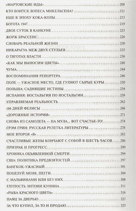 Как я понял, эти 159 заметок по 2-3 страницы каждая написаны Габриэлем Гарсиа Маркесом в период с 1961 по 1984 гг. Большинство из них посвящены проблемам стран Латинской Америки, различным событиям в мире, литературе, музыке. Есть среди них история про происхождение Кока-колы, про приведений на дороге, про Боинг-747 сбитый СССР, про космонавтов, застрявших на орбите, даже про имплантирование фаллопротезов и многое другое.