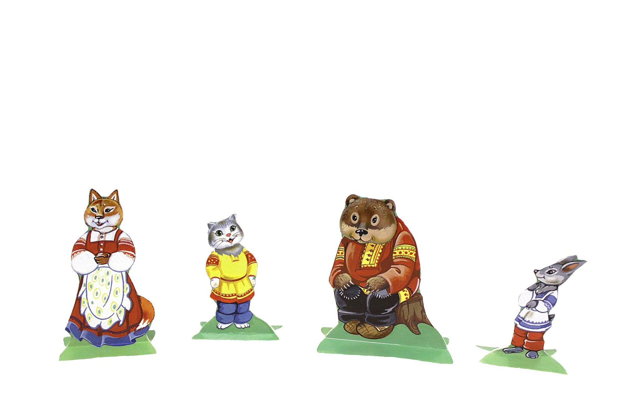 Фигурки — 5 зверей плюс папаха и мундир для кота — двусторонние (кроме папахи), вырезаны аккуратно, сложены в пакетик с липким краем. Для их хранения склеен специальный картонный кармашек в начале книги — очень продумано.