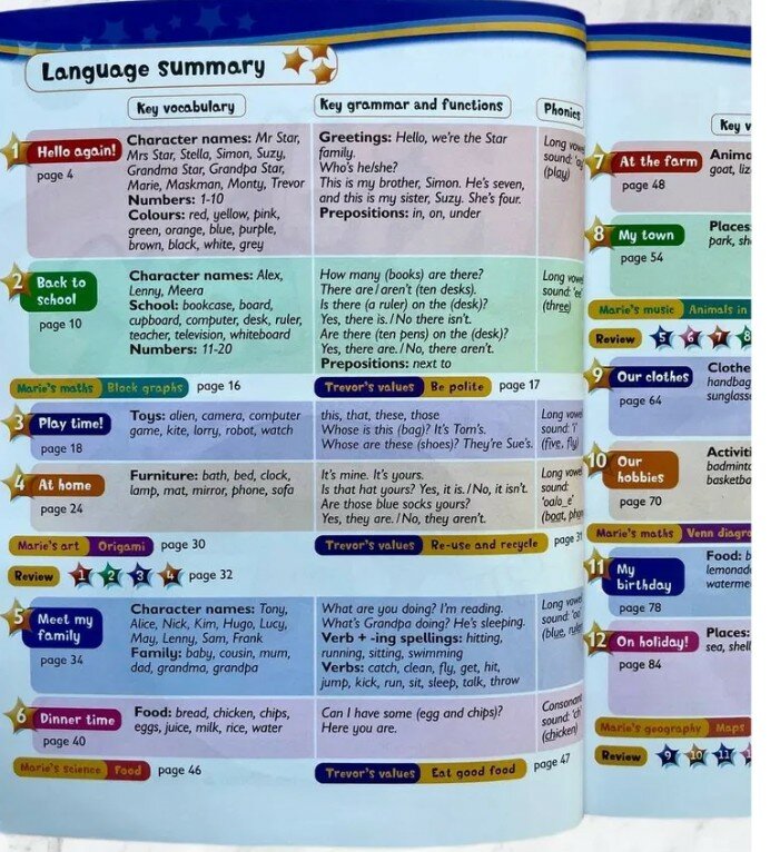 Каждый юнит состоит из 6 уроков, материал одной страницы рассчитан на 1 урок. После каждых 4 юнитов даётся урок повторения и закрепления материала. Содержание учебника дополнено материалами для изучения других предметов, например, арифметики и биологии, посредством английского языка. Межпредметные связи и развитие учебных и языковых навыков позволят расширить кругозор учеников, а увлекательный материал, предлагающий множество весёлых песен, игр, увлекательных рассказов и творческих заданий, развивающих смекалку и креативность, повысят интерес к изучению языка.