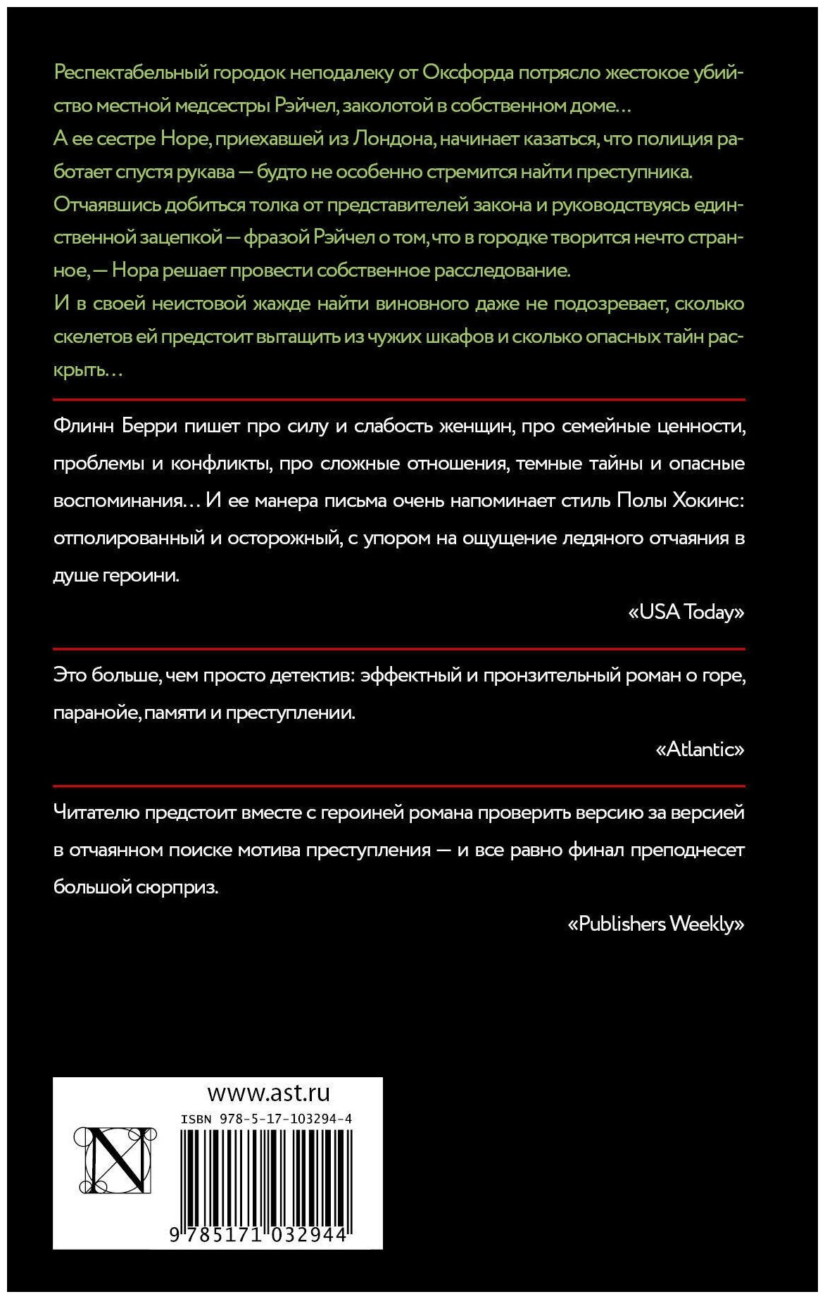 Кратко о книге: В сюжетной линии задействованы две сестры и ключевые жители городка. После смерти Рэйчел под подозрением у Норы почти все мужчины в городе. Допытываясь до произошедшего, она узнает многое, что от нее скрывала сестра, а потом и вовсе сама попадает под подозрение. Но тут появляются новые подозреваемые и знакомые "из прошлого". И вот тут начинается развязка....