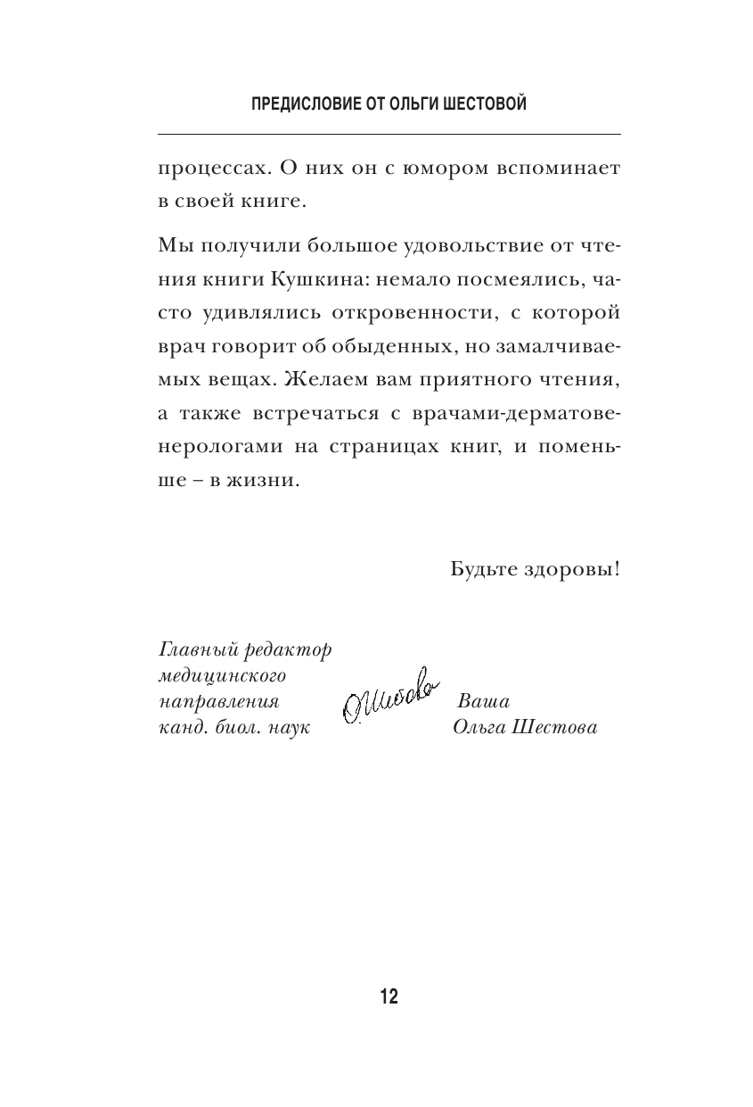 На самом деле венерологов именуют дерматовенерологами , поскольку их прерогативой являются не только слизистые оболочки , страдающие в том числе и от вредоносных микробов , грибков и вирусов , передающихся половым путём , но и самый большой по объёму орган человеческого тела- кожа. Сами эти врачи называют себя «кожниками»и даже «шкурниками» и занимаются своими пациентами годами , поскольку большинство патологических состояний кожных покровов и слизистых оболочек- хронические страдания , то затухающие , то обостряющиеся. Таким специалистам всегда есть что рассказать из своего обширнейшего опыта , свидетельством чему служит и настоящая книга с откровенным названием. Занятно , правдиво , узнаваемо. Читать стоит не только пациентам , но и коллегам. Вы теперь понимаете…почему среди врачей так много писателей , а сам создатель романа века "Мастер и Маргарита " Михаил Булгаков в молодые годы после окончания медицинского факультета служил именно дерматовенерологом!