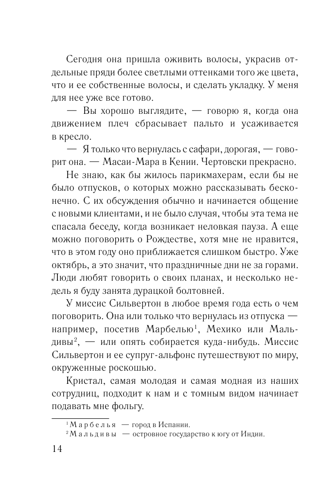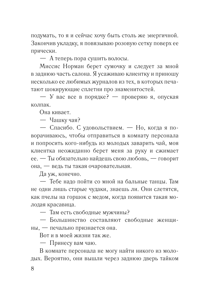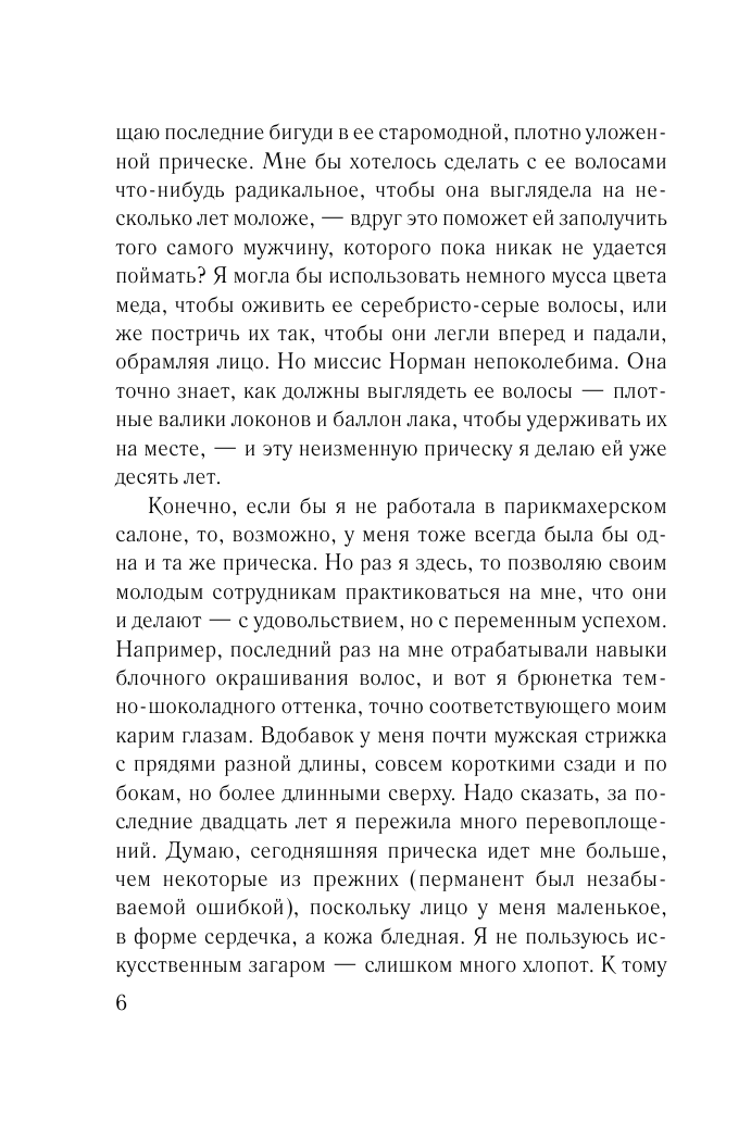 Главная героиня одинока, ей за 30 и похожа на серую мышку. Мне понравилось её описание жизни, её будней, как она ведёт однообразный образ жизни:ходит на работу, домой. Читаешь и понимаешь, что она как \"обычный человек\" живёт, как большинство людей. И вот она по совету клиентки решает поехать в Африку. С этой поездки меняется её жизнь.