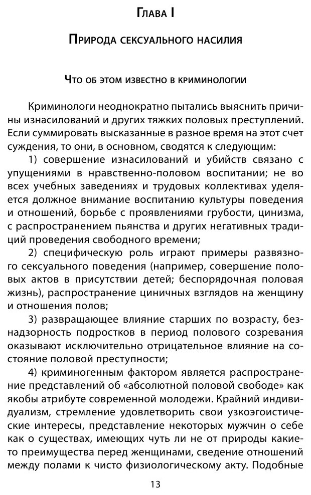 Данное издание является перепечаткой старой книги Антонян Ю.М., Ткаченко А.А. Сексуальные преступления. Чикатило и другие: Научно-популярное исследование. М. Амальтея. 1993г. 320 с. Причем соавтор полностью исчезает в данном издании из упоминания, ссылок на первичный исходник также нет, что очень печально. Сама книга интересна, хоть и не бесспорна. Актуальность спустя 24 года не потеряла, увы. Качество издания среднее - кроме посредственного оформления еще и дешевая шершавая бумага, клинические примеры не выделены шрифтом, что затрудняет их поиск в дальнейшем. В итоге 6 из 10, и то только за классику жанра.
