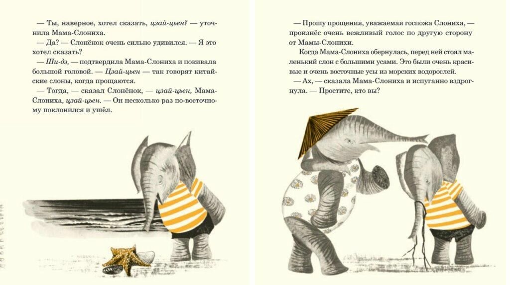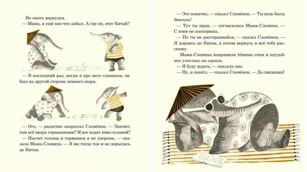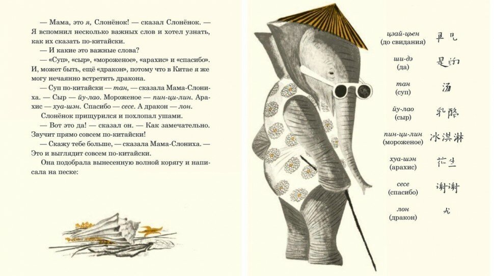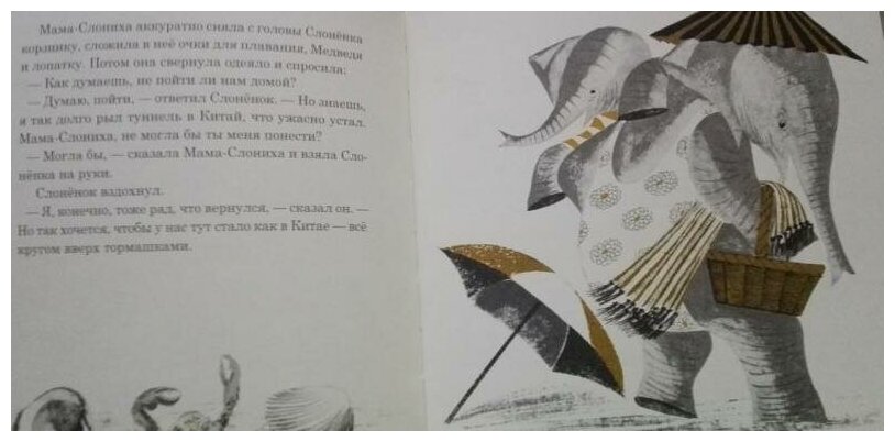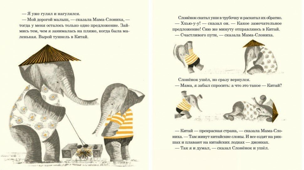 Очень милая, забавная и умная история. Итак, море и пляж. Мама загорает, Слоненок плавал и проголодался, но у мамы для него только пара гамбургеров. Слоненок не наелся. Тогда мама предлагает сынуле прорыть туннель в Китай, как делала она, когда была маленькой. Мама рассказывает Слоненку о Китае, учит нескольким китайским словам (настоящим!) и чертит на песке пару иероглифов. Слоненок в восторге, начинает копать, а мама загорает дальше. В ямке-туннеле ребенок-слоненок находит монетку, вылезает из туннеля и думает, что он уже в Китае. Идет по улице, обедает в ресторане, катается на аттракционах и, счастливый, возвращается к маме. Рассказывает, как он был в Китае, мама, конечно, падает в обморок, но все чудесно кончается. Мама несет уставшего Слоненка на ручках, но держит его вверх ногами, чтобы «было как в Китае». Книга написана с огромным чувством юмора, переведена отличным русским языком (спасибо переводчику и редактору). Совсем не ощущается, что она написана 54 года назад! А значит, это уже классика.