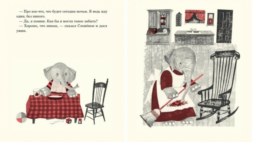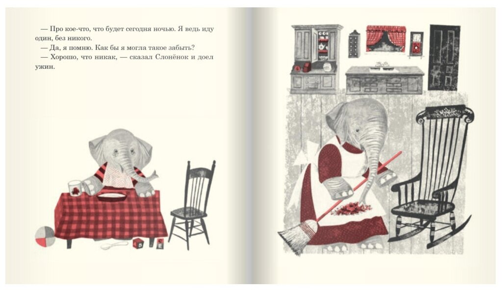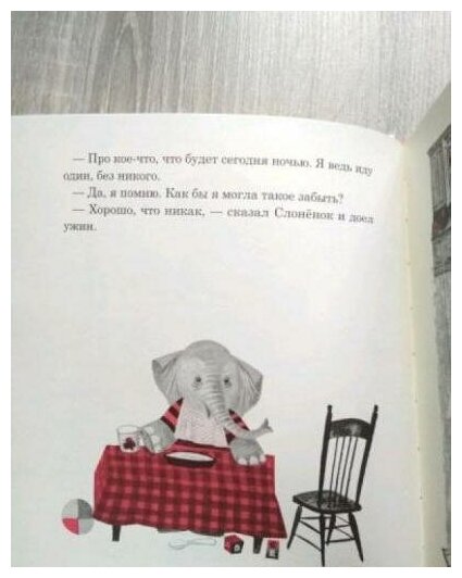 Слоненок куда-то собрался идти вечером ОДИН! Впервые! Поэтому он солидно поужинал, Мама-Слониха по этому поводу испекла «специальный Слонёночный торт». Потом Слоненок оделся на все случаи жизни, взял саблю и еду, трогательно (очень много нужной для малышей лексики и правил этикета) попрощался со всеми. Уже у двери Мама-Слониха напомнила сынуле, что тот забыл почистить зубы. Не раздеваясь, он почистил зубы и умылся и «с фонарем и с саблей, Слоненок храбро зашагал по коридору. Потом он храбро свернул в свою спальню, бесстрашно запрыгнул на кровать и с головой укрылся одеялом.» Один! Сам! Но из кровати он все-таки протрубил всем: «Спокойной ночи!»Причем интрига, куда же он все-таки идет, оставалась до последней страницы.