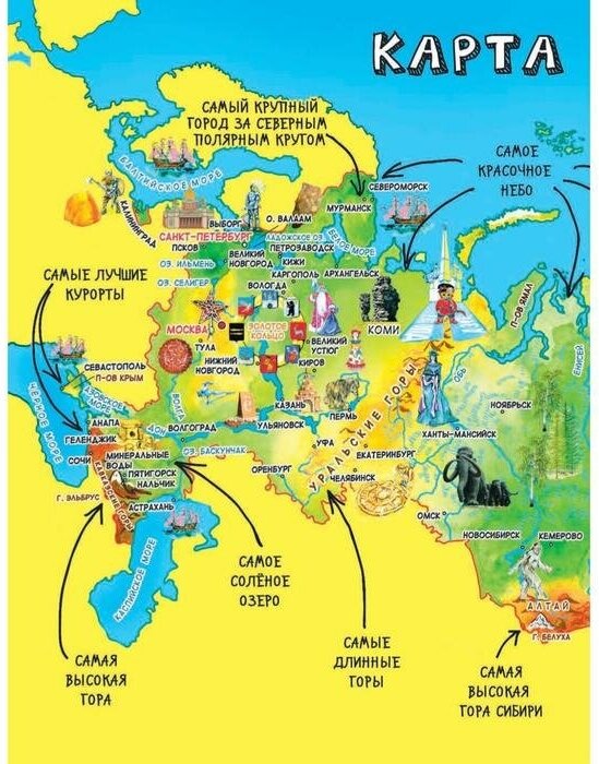 С ним вы отправитесь в увлекательное путешествие по нашей необъятной родине от ее столицы Москвы и до самого большого острова Сахалин на Дальнем Востоке. За это время вы узнаете, чем славятся города Золотого кольца, где в России находятся пряничный рай и танцующий лес, почему Урал - это драгоценная шкатулка России, а Алтай - самое заповедное место, и что скрывается за загадочными названиями Карелия, Камчатка и Чукотка. Также вы посетите самую высокую в России гору Эльбрус, самое холодное место и самое глубокое на планете озеро Байкал. Хорошо ориентироваться в нашей большой стране вам поможет красочная карта. Кроме того, в путеводителе вы найдете разнообразные задания и головоломки, с ними узнавать нашу страну станет еще веселее.