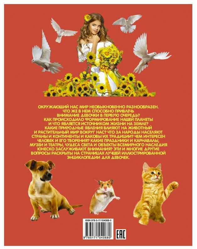 Эта замечательно иллюстрированная книга расскажет обо всем, чем интересуется каждая подрастающая девочка. Наша удивительная планета, животный и растительный мир, человек и его уникальные способности и таланты, известные карнавалы, театры и музеи мира, чудеса света и объекты, внесенные в Список всемирного наследия ЮНЕСКО, - это только некоторые из тем нашей удивительной энциклопедии. Она адресована всем современным девочкам, которые стремятся познать окружающий мир.
