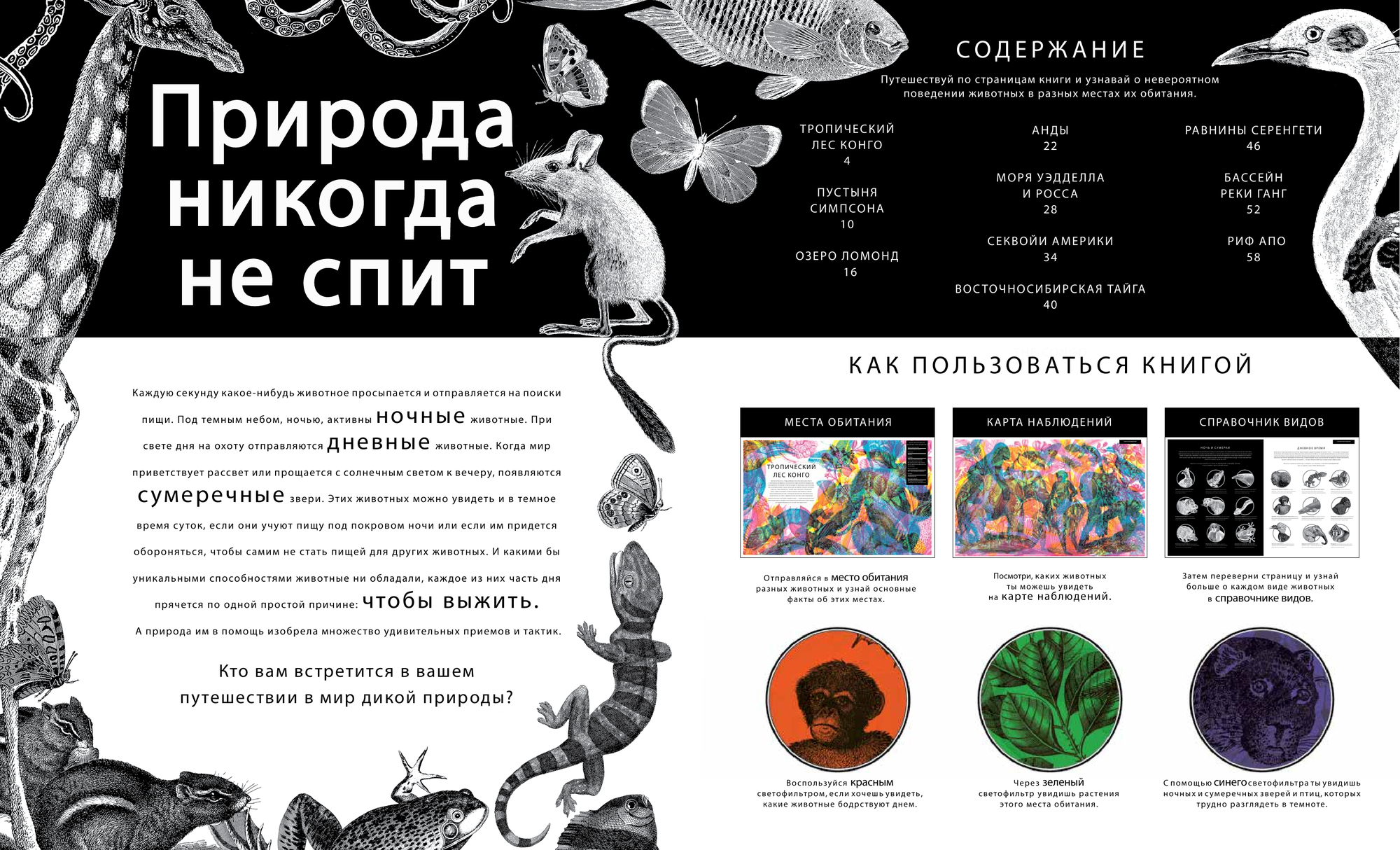 Одной из основ для гармоничной жизни любого человека на планете Земля – это общение с природой. Справочная информация в книге дана в следующем ключе: общие сведения о каждой зоне, карта наблюдений и справочник видов животных. Путешествуя по страницам книги и рассматривая каждую иллюстрацию через цветные окошечки визира, читатель увидит: через красный фильтр – животных, которые бодрствуют днем, через зеленый фильтр – растения этого места обитания, с помощью синего светофильтра мы увидим ночных и сумеречных зверей и птиц. Данная книга даст возможность совершенно новым взглядом увидеть десять очень разных природных зон нашей планеты, каждая из которых по-своему уникальна и знаменита на весь мир. Вы побываете в тропическом лесу Конго, в пустыне Симпсона, увидите вековые секвойи Америки и многое другое. Один из разделов книги посвящен природе России, ее восточно-сибирской тайге, площадь которой 3,9 миллионов км2. Эта экосистема является одним из самых протяженных естественных лесов в мире. Зимой, когда снег покрывает лес снизу доверху снежным одеялом, температура падает до -60 о С. Летом, когда температура превышает 40 о С, на короткое время наступает жара, прогревающая лес после зимы. Это местообитание с экстремальными условиями жизни в любое время года. Трехцветный визор поможет увидеть растительный и животный мир края в разное время суток, поможет глубже погрузиться в душу природы, стать ее частичкой, лучше понять ее.