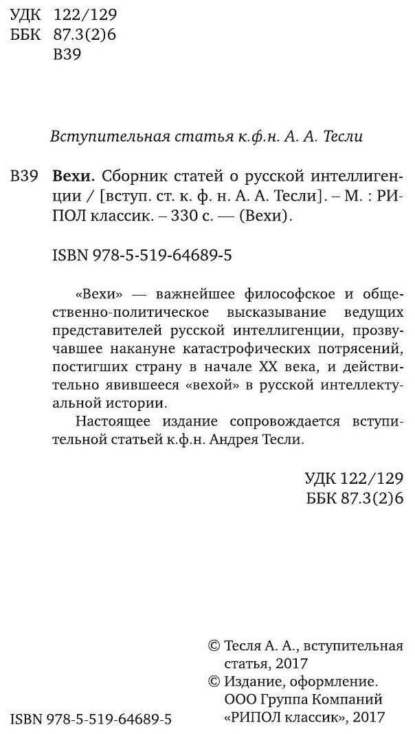 "Вехи" - важнейшее философское и общественно-политическое высказывание ведущих представителей русской интеллигенции, прозвучавшее накануне катастрофических потрясений, постигших страну в начале XX века, и действительно явившееся "вехой" в русской интеллектуальной истории.