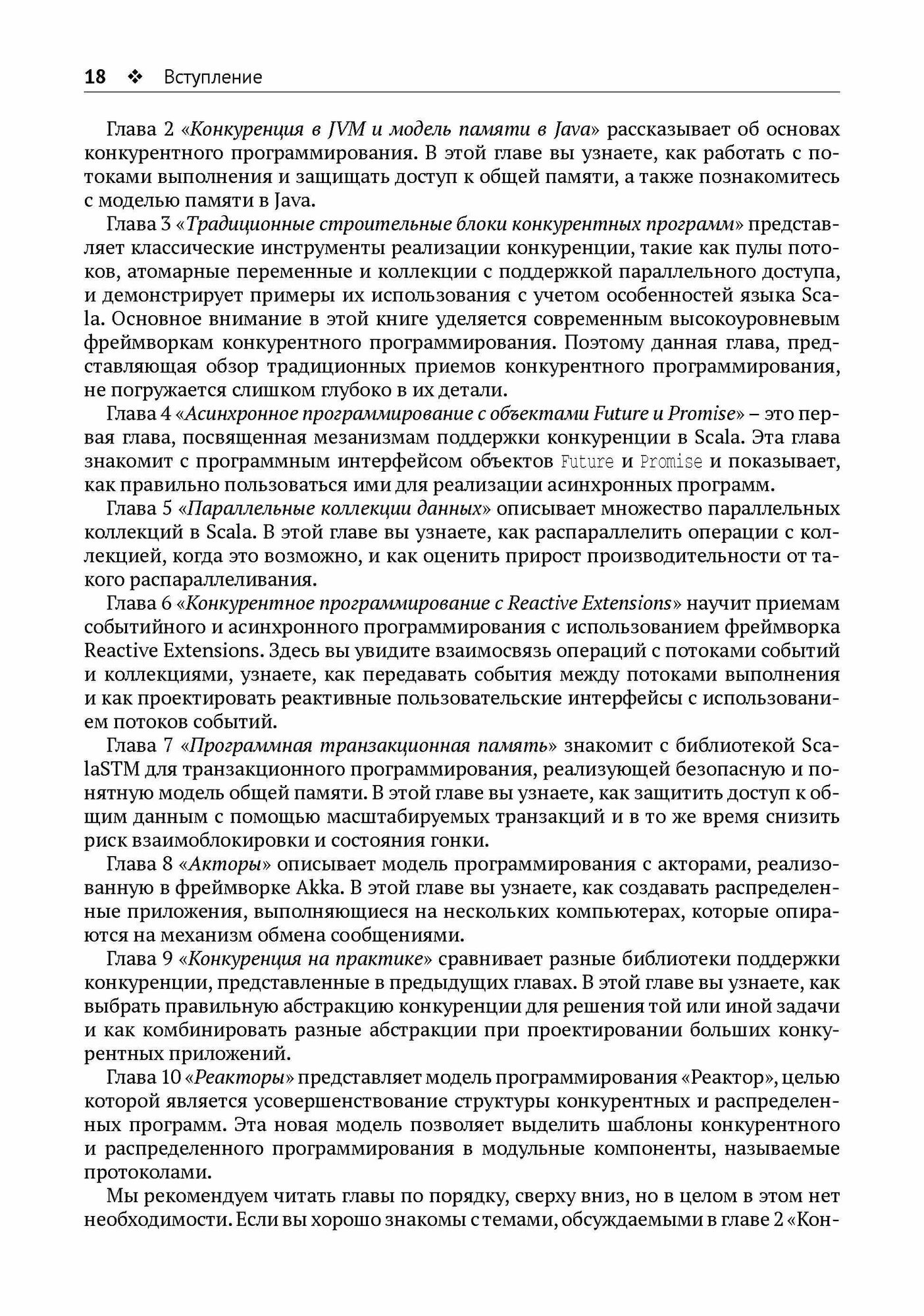 Книга начинается с введения в основы конкурентного программирования в JVM и описания модели памяти в Java, а после демонстрирует основные строительные блоки для реализации конкурентных вычислений, такие как атомарные переменные, пулы потоков и конкурентные структуры данных. Затем рассматриваются разные высокоуровневые абстракции конкуренции, каждая из которых ориентирована на решение определенного класса задач, при этом затрагиваются самые последние достижения в поддержке асинхронного программирования. Также охватываются некоторые полезные шаблоны и способы использования описываемых приемов. В заключение дается краткий обзор применения разных библиотек поддержки конкуренции и демонстрируются возможность их совместного использования.