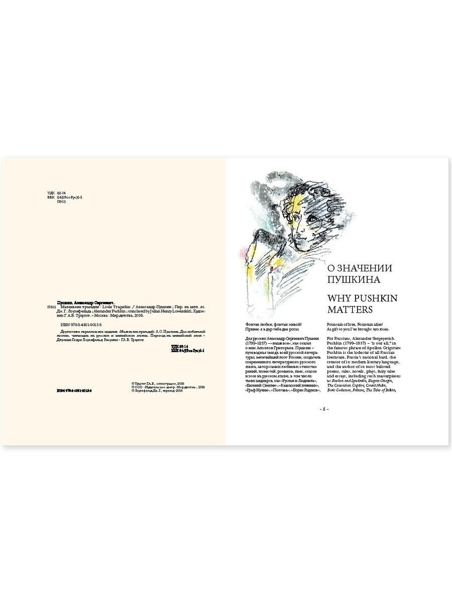 Двуязычное параллельное издание "Маленьких трагедий" А.С.Пушкина. Для любителей поэзии, читающих на русском и английском языках. Перевод на английский язык - Джулиан Генри Лоуэнфельд. Рисунки - Г.А.В.Траугот.